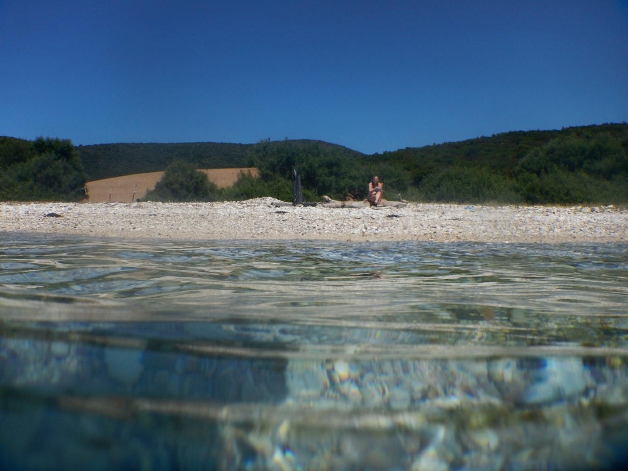 Wij duiken gelijk in het heldere blauwe water. Wat een lekkere temperatuur heeft dat nu inmiddels. We gaan snorkelend naar het strandje. We zijn nog een beetje beducht voor zee-egels, maar die zijn hier niet. Wel weer veel visjes. Marianne maakt een strandwandeling, met waterschoentjes die ik vergeten was, en ik ga terug om het anker controleren.