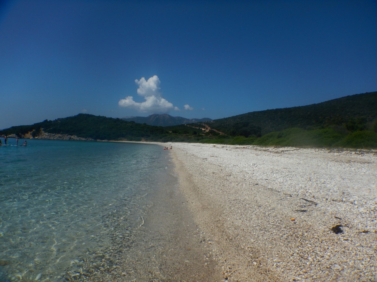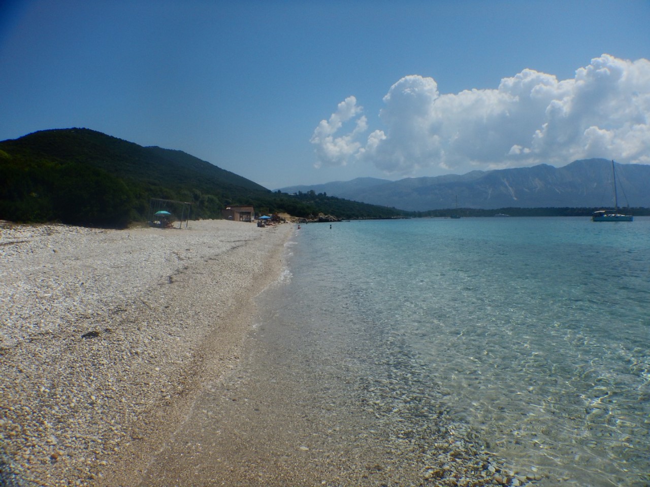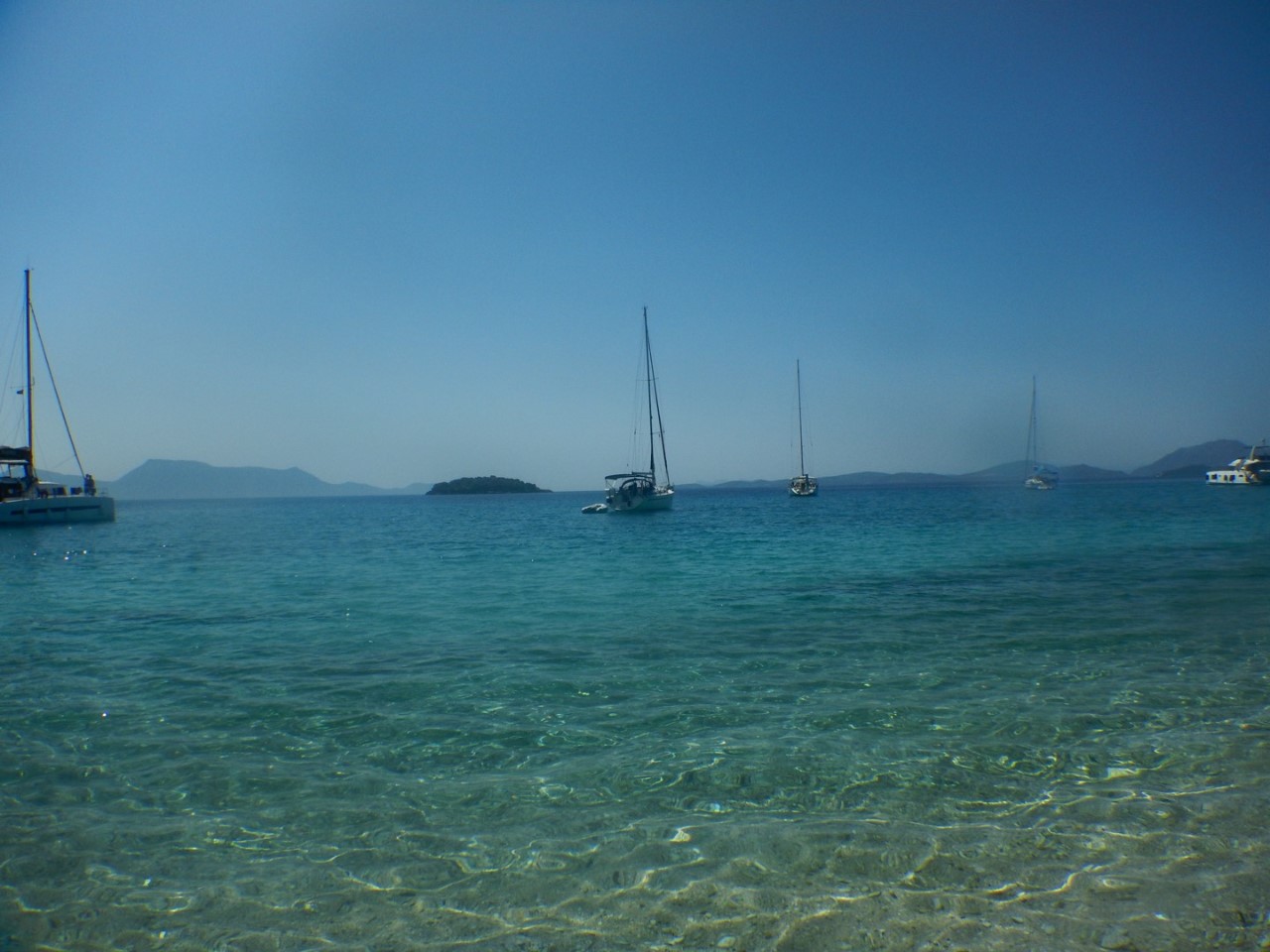 We vinden het hier een mooie omgeving. Er zijn rondom hoge bergen, er is een mooi strandje, helder blauw water, we nemen nog maar een duik. Wel is er op de dag een eind verderop een bulldozer op het strand, vanwege de aanbouw van de eerste beachbar. Wel jammer, want het is hier verder alleen maar natuur. Tegen vier uur is het stil. We kijken vanuit de kuip naar het eiland Lefkas. Het beschut dit hele vaargebied tegen de swell van zee. We verwachten een rustige nacht.