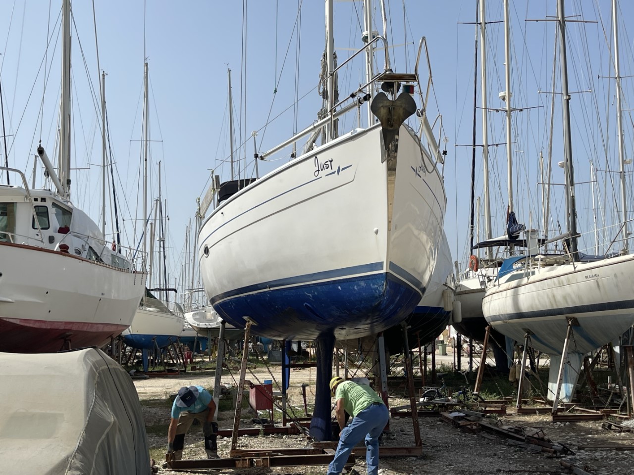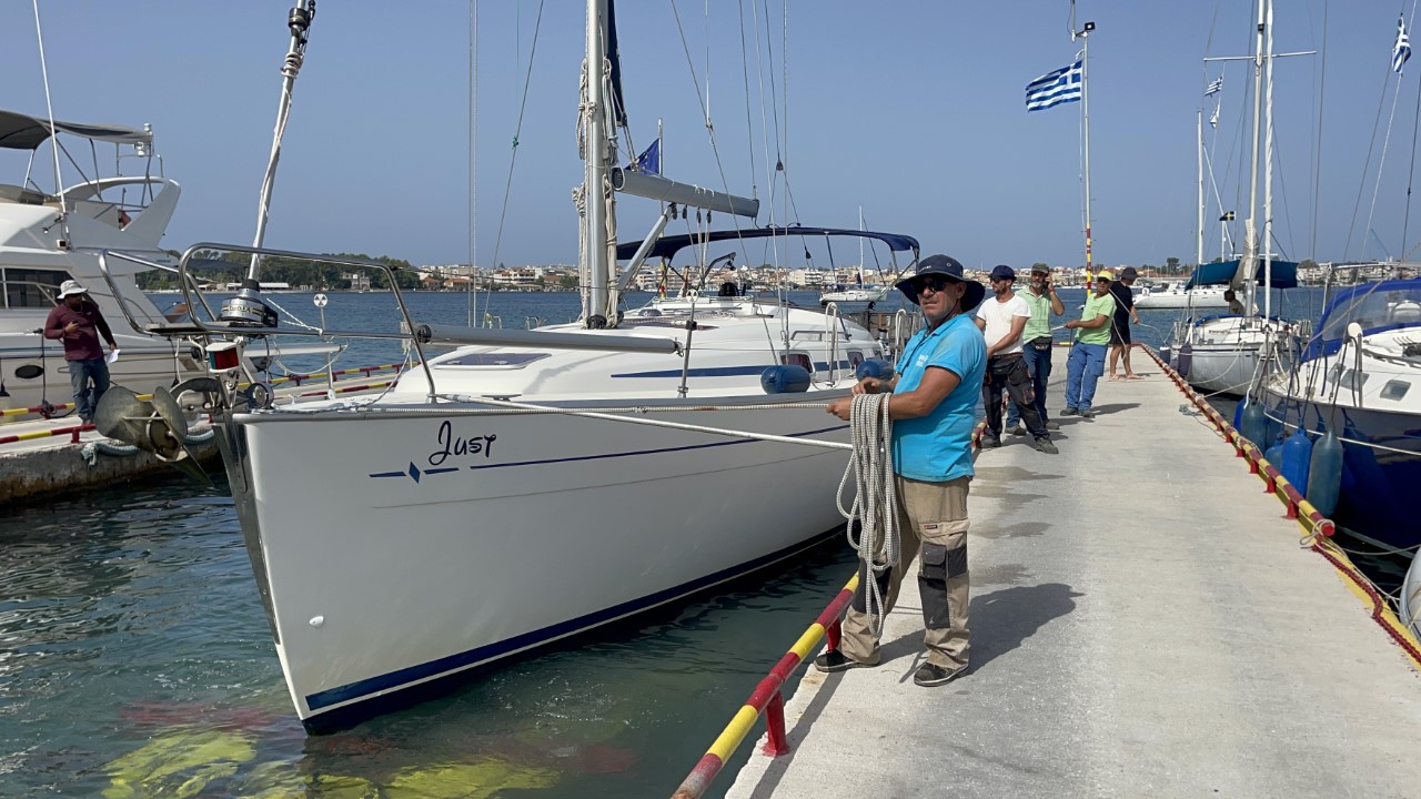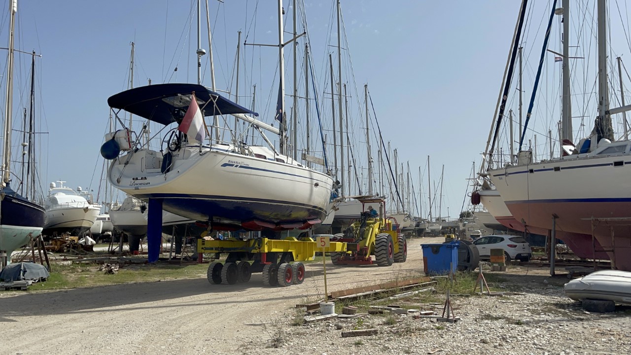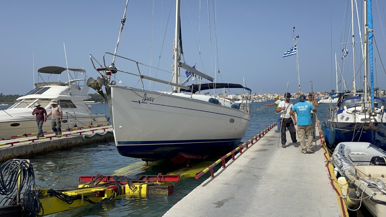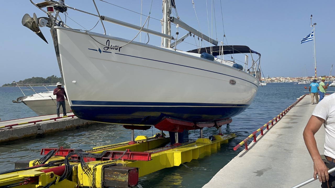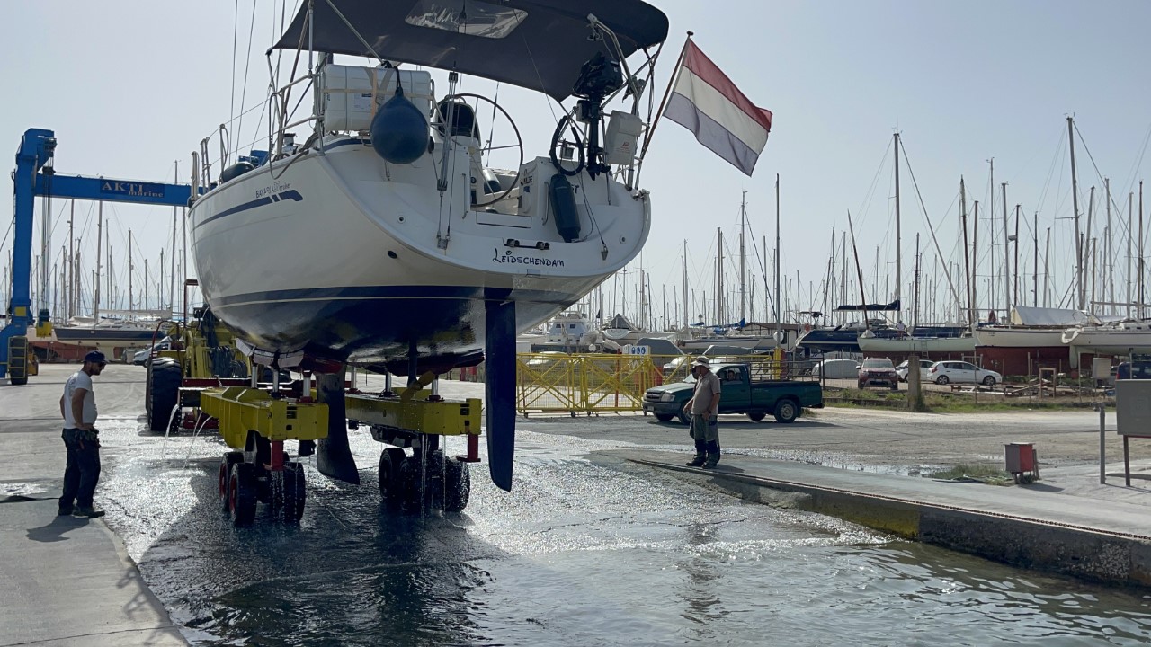 Het zit er op. We halen nog wat brood en wat laatste boodschapjes en we gooien de lijnen los van de stadskade en halen ons anker op. We varen heel langzaam naar de overkant en laten ons anker vallen vlakbij de helling, waar de Just de kant op wordt gehesen. We zijn iets te vroeg, maar we melden ons per telefoon, dat we gereed zijn. We krijgen te horen, oké, het is erg druk en we bellen als jullie aan de beurt zijn. De afspraak is, dat we om 10:30 uur aan de beurt zijn. Maar ruim na 11:00 uur is er geen enkele beweging meer op de werf. We bellen nogmaals of ze ons niet vergeten zijn. Nu krijgen we te horen, dat het nog ongeveer 15 minuten duurt. Het zijn Griekse minuten, die moet je verdubbelen. Uiteindelijk worden we om 11:45 uur uit het water gesleept en niet gehesen.