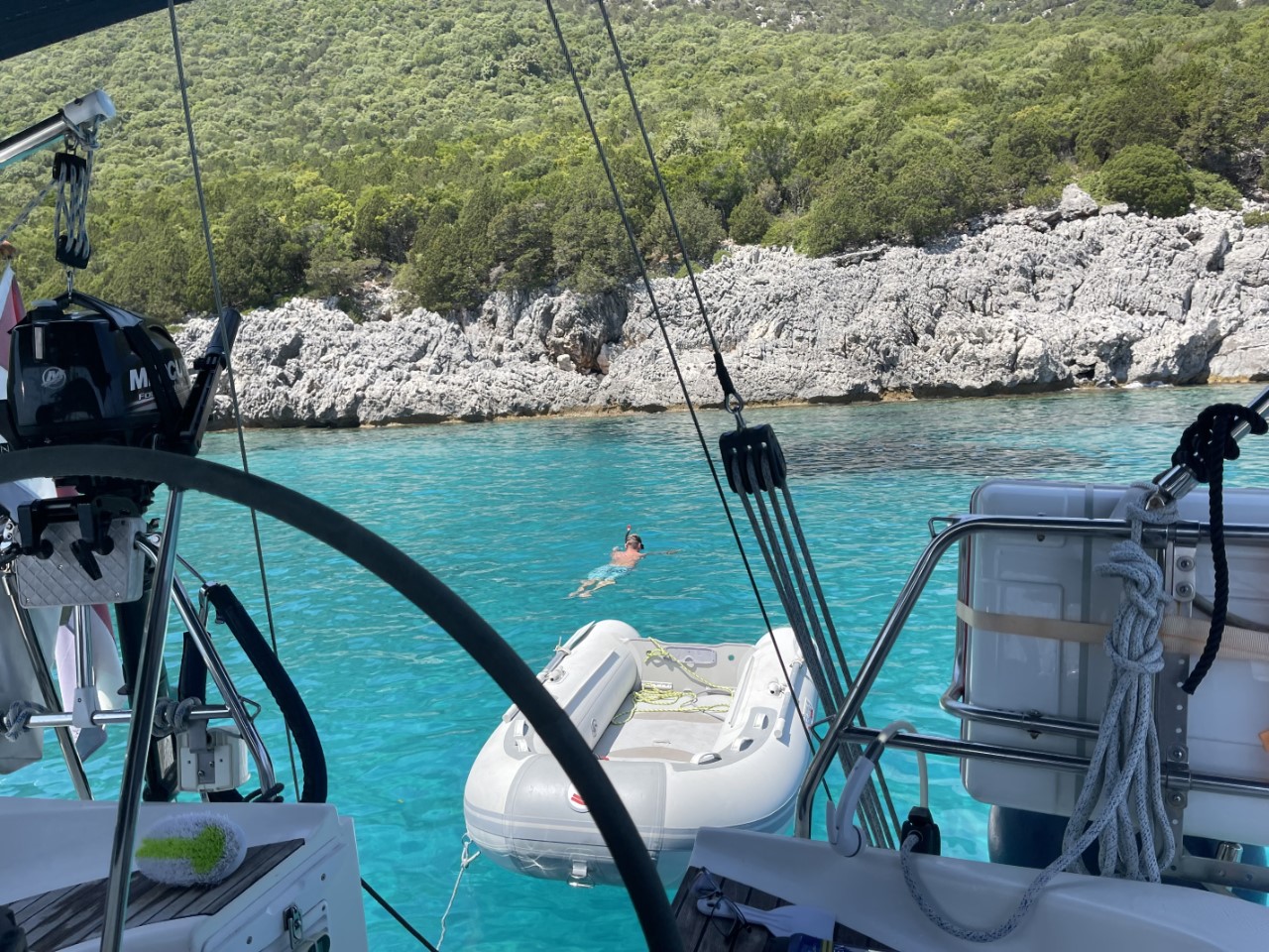 Dat is een tegenvaller. Ik wilde de Just even schoonborstelen en de watertank vullen, is het Griekse water op. Een technisch probleem. Ergens vandaag gaat het misschien opgelost worden. Dan gaan we maar boodschappen halen. We hebben besloten om naar een ankerplekje te varen. We varen langs de oostkust, maar dat is aan lager wal. De weerberichten geven heel weinig wind door voor de nacht, dus we gaan het wel merken of het kan of niet.
