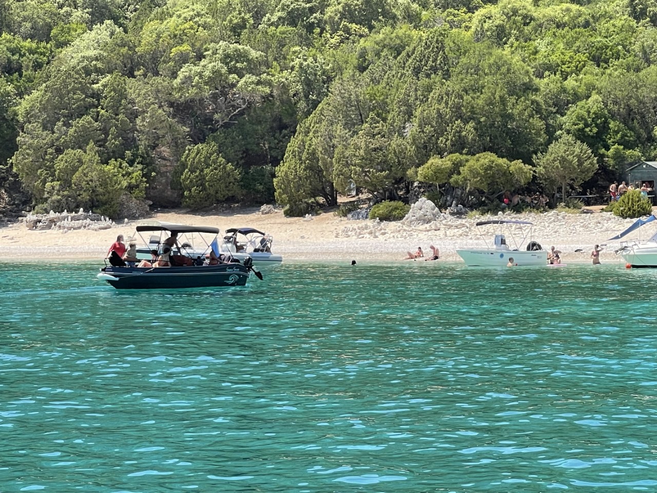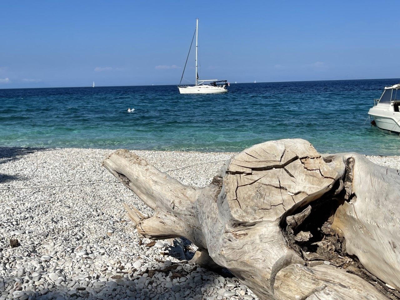 De uitgekozen baai is nog mooier, dan we hadden verwacht. Er is een mooi strandje, waar je alleen via de boot of een 6 km lange wandeling kunt komen, er is helder blauw water en voldoende zand voor ons anker. We liggen dan ook snel in het heerlijke water. Af en toe komt er een toeristenbootje langs met een groep en er zijn een paar kleine motorbootjes, maar die bezoekjes zijn kort. We maken een kipschotel en we doen een dutje.