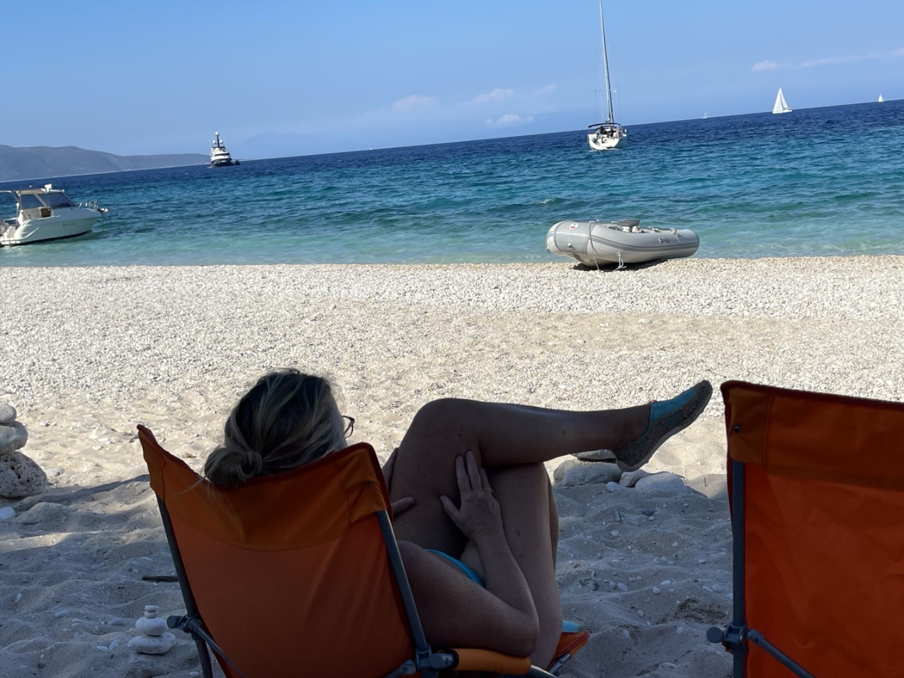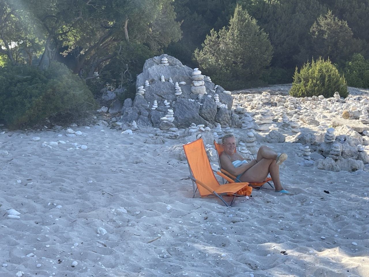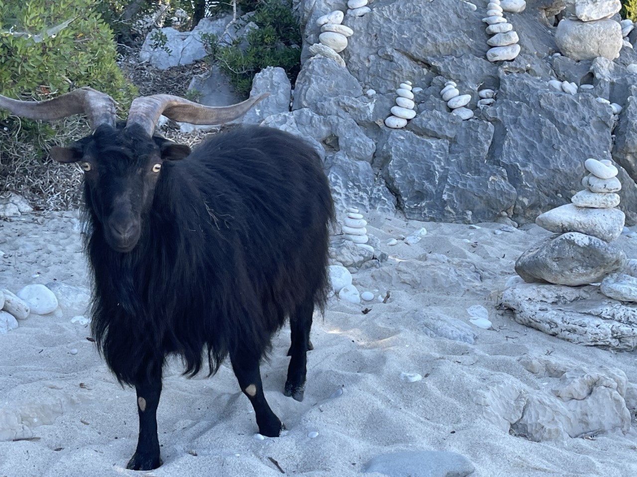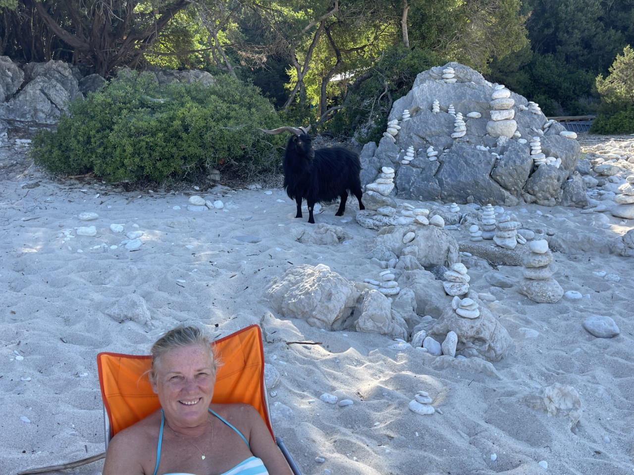 In de namiddag roeien we met klapstoeltjes naar het strandje en zitten daar op het strand totdat de zon achter de berg verdwijnt. Het strandje is bij de waterlijn van kiezels, maar daarachter is het mooi zand. Iemand heeft keien in balans op elkaar gelegd en dat doet een beetje zen aan. De strandgeit wil graag op de foto en komt regelmatig even langs of hij bestelt iets bij het piepkleine strandtentje. We willen daar een waterijsje halen, maar die verkoopt hij niet. Wel heeft hij ijsklontjes, maar dat was een Griekse spraakverwarring. Daniel en Marianne lopen een klein stukje over het pad omhoog de berg op. Er is een vrij dicht bos en ze volgen de droge bedding van een beekje omhoog. Er zijn veel krekels en het ruikt er naar dennen.