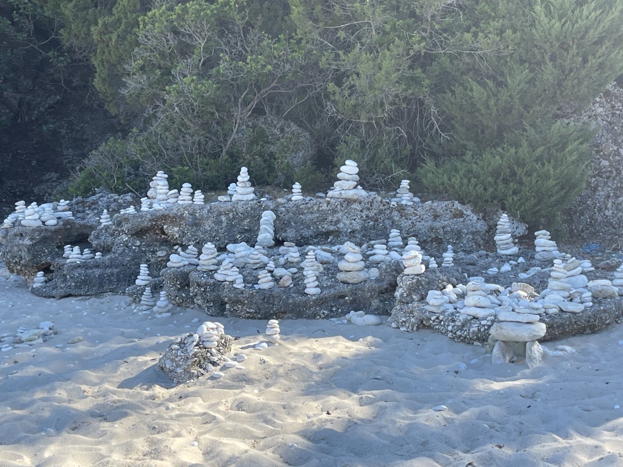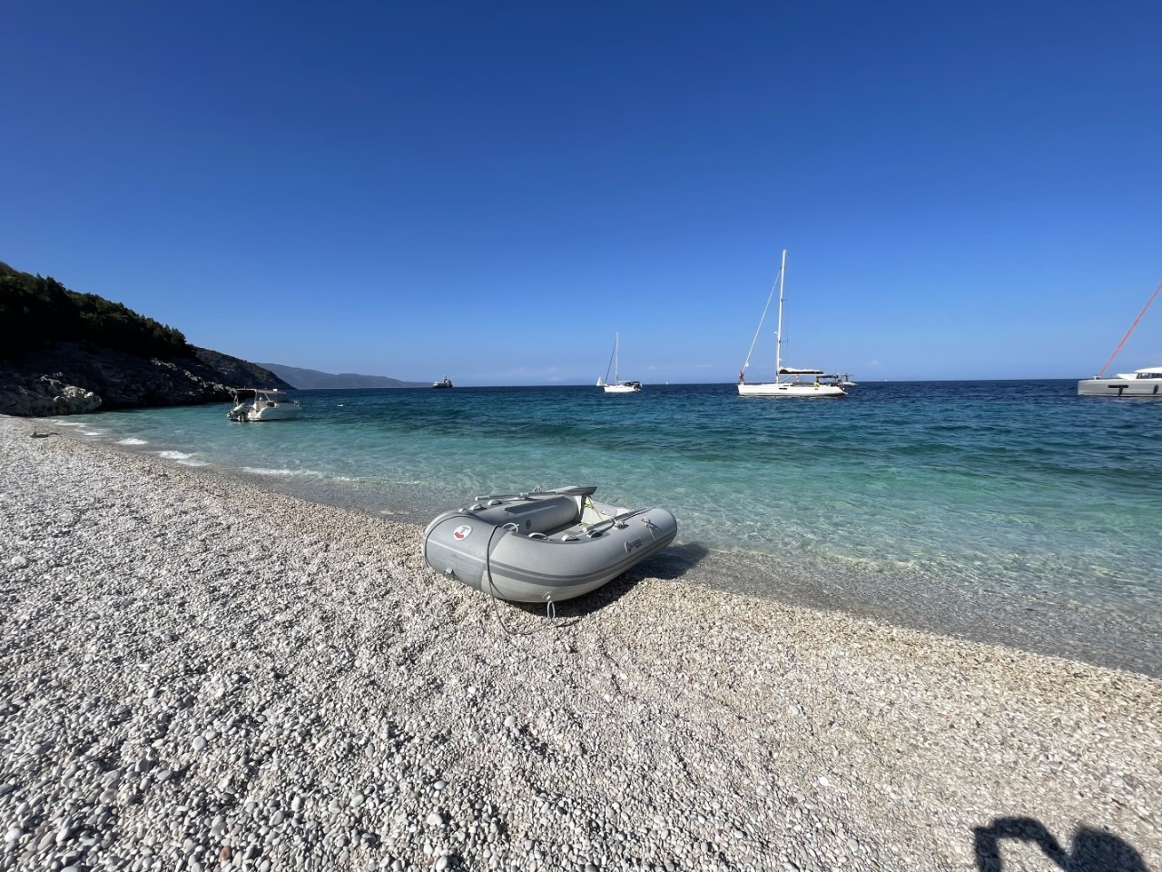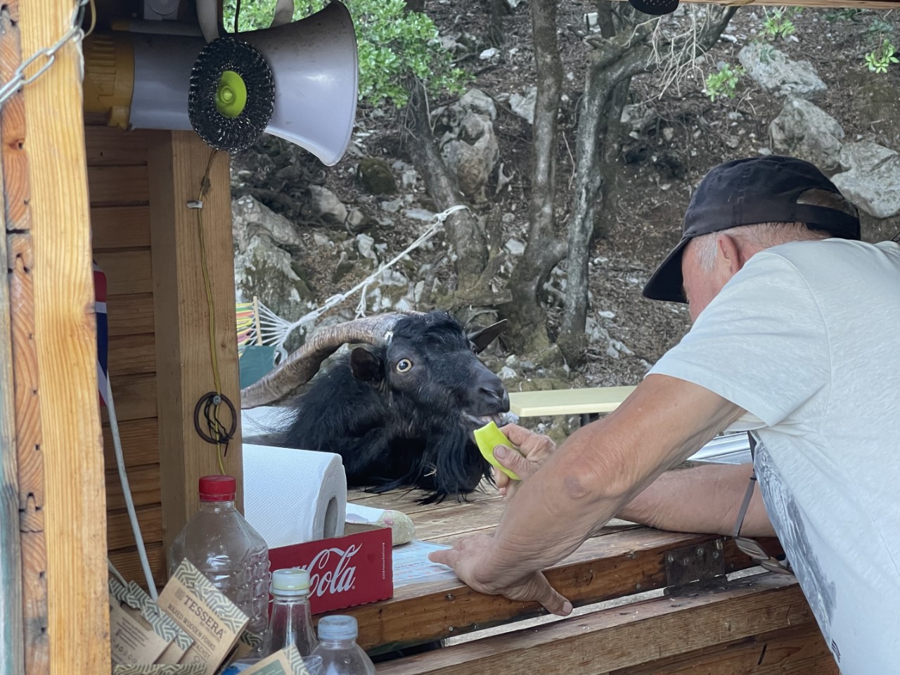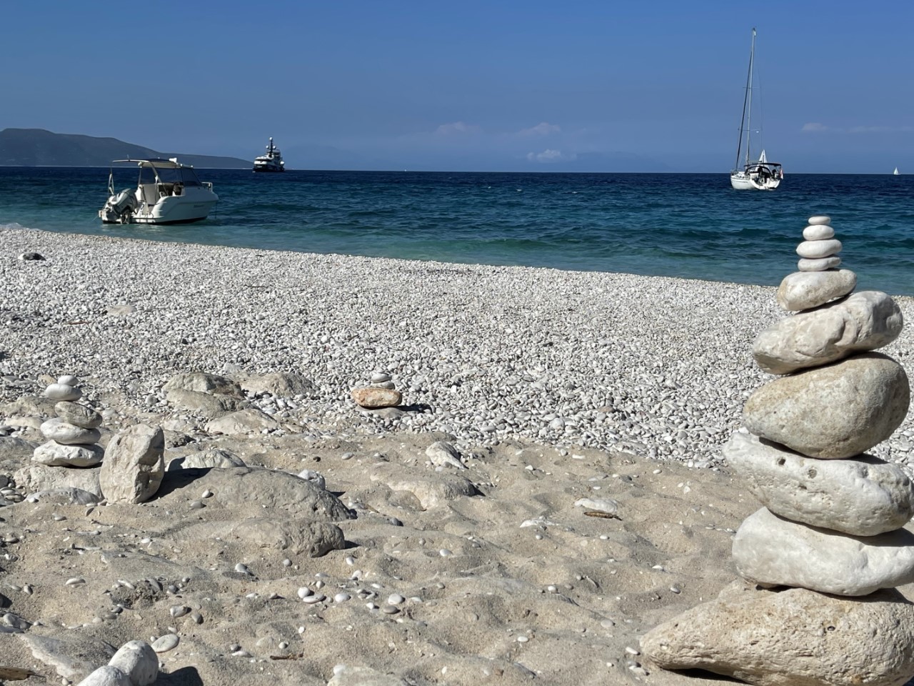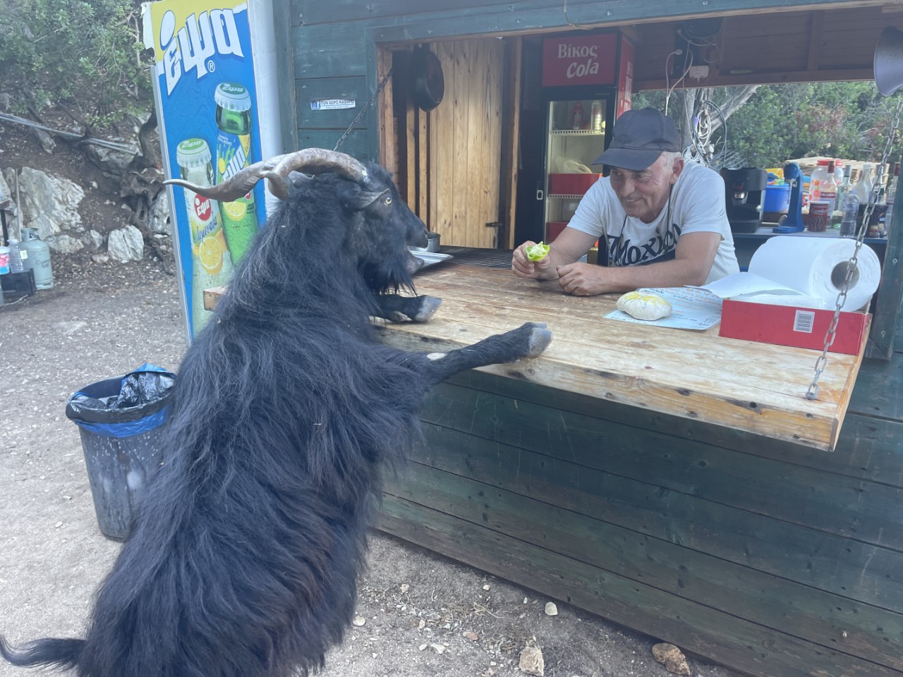 In de namiddag roeien we met klapstoeltjes naar het strandje en zitten daar op het strand totdat de zon achter de berg verdwijnt. Het strandje is bij de waterlijn van kiezels, maar daarachter is het mooi zand. Iemand heeft keien in balans op elkaar gelegd en dat doet een beetje zen aan. De strandgeit wil graag op de foto en komt regelmatig even langs of hij bestelt iets bij het piepkleine strandtentje. We willen daar een waterijsje halen, maar die verkoopt hij niet. Wel heeft hij ijsklontjes, maar dat was een Griekse spraakverwarring. Daniel en Marianne lopen een klein stukje over het pad omhoog de berg op. Er is een vrij dicht bos en ze volgen de droge bedding van een beekje omhoog. Er zijn veel krekels en het ruikt er naar dennen.