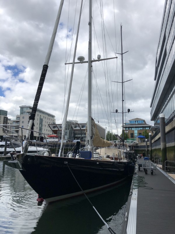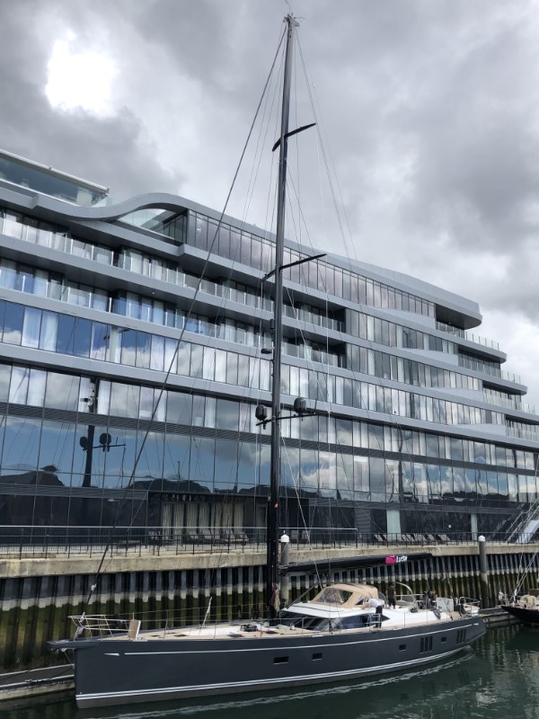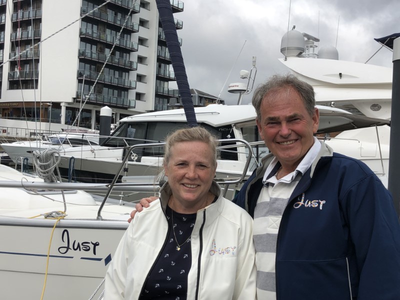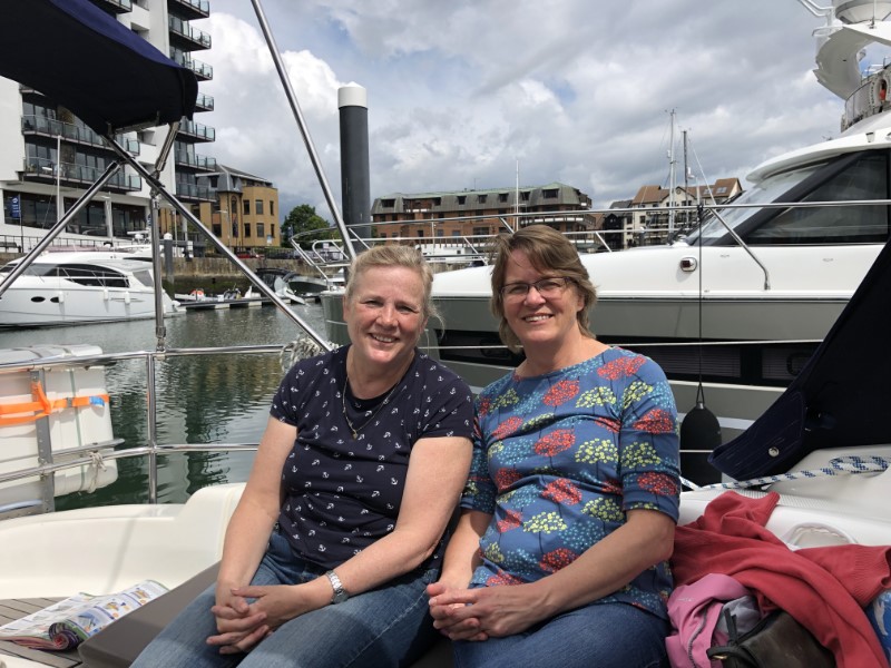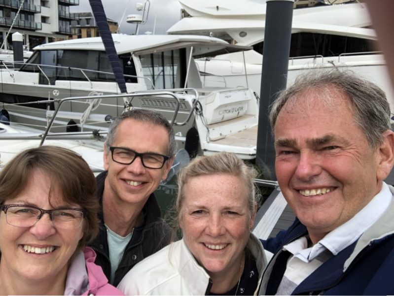 Het werd geen romantische filmavond Marianne ging schilderen en ik heb wat op m’n iPad zitten klikken. Het heeft tot vroeg in de ochtend geregend, maar toen wij opstonden was het gelukkig droog en scheen er een waterig zonnetje. De lijntjes werden los gegooid voor één van de kortste tochten tot nu toe van 1,3 nm. We hebben de motor bijna niet gebruikt, we dreven met de stroming van ruim 2 knopen zo naar Ocean Village Marina. De marina heeft sinds ons vorige bezoek een flinke opknapbeurt gekregen. Zelfs de dockmaster stond ons op te wachten op de steiger, wat een service. Het zonnetje brak flink door en toen ik in de kuip een boekje zat te lezen, hoorde ik ineens mijn naam roepen vanaf de kade. Marianne haar nichtje Theresa en Roger haar man waren gearriveerd. Ze waren speciaal vanuit Millbrook, ongeveer 2 uur rijden, naar Southampton gekomen om ons te bezoeken. Na een rondleiding op de Just hebben we gezellig met stokbroodjes en koffiebroodjes zitten kletsen. Marianne met Theresa over vroeger en ik met Roger over allerlei nieuwe technische snufjes en hoe die aan boord gebruikt worden. Het begon toch weer een beetje te miezeren en in de kajuit was het tijd voor een “cup of tea” met Homemade Carrotcake en icing van Theresa, die gemakkelijk de finale had gehaald bij The Great British Backoff. Door de gezelligheid vloog de tijd voorbij, maar de tijd drong voor ons en we stelden voor een bootmaaltijd te maken nasi met pindasaus of naar de Wetherspoon. Het werd het laatste, we hadden mazzel het was Teusday Steaknight, voor 8,05 pond een flinke steak met een drankje naar keuze. Tijd voor een toetje was er niet meer, alhoewel, Theresa had het over dropjes die ze zo mist. Wij hebben voldoende voorraad, dus liep ik even snel naar de Just om een zak drop te halen. Ik ben benieuwd of die hun terugreis van 2 uur overleeft heeft. Na het afscheid liepen wij snel naar het Mayflower theater voor Matilda The Musical. Marianne heeft ooit het verhaal aan onze jongens voor het slapen gaan voorgelezen, dus had er veel herinneringen aan. Het was een leuke musical in een uitverkocht theater. In een donker Southampton wandelen we terug naar de Just.