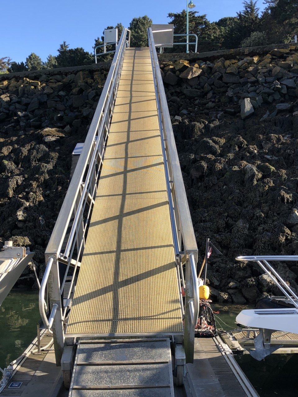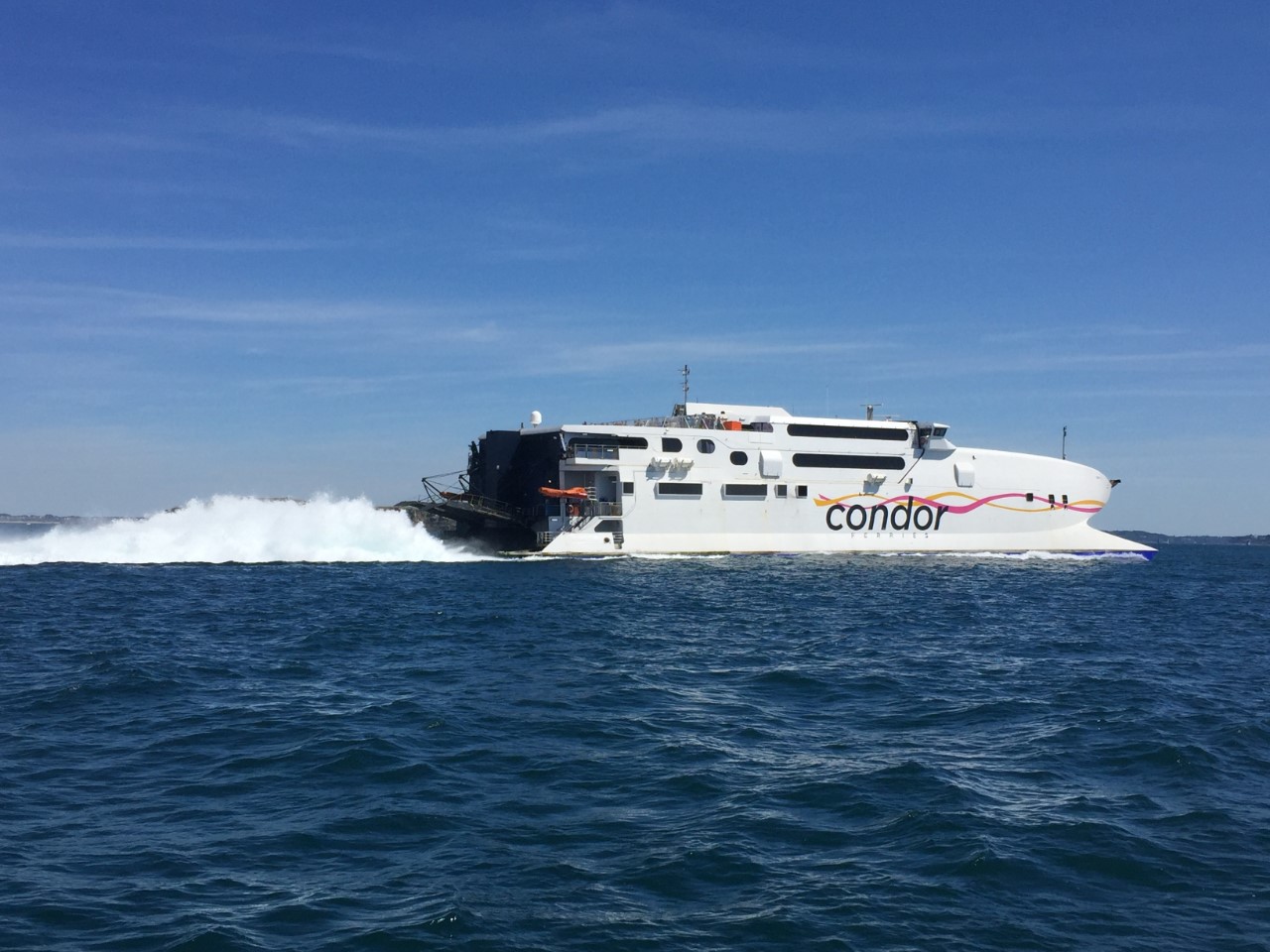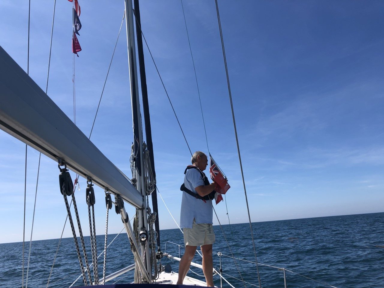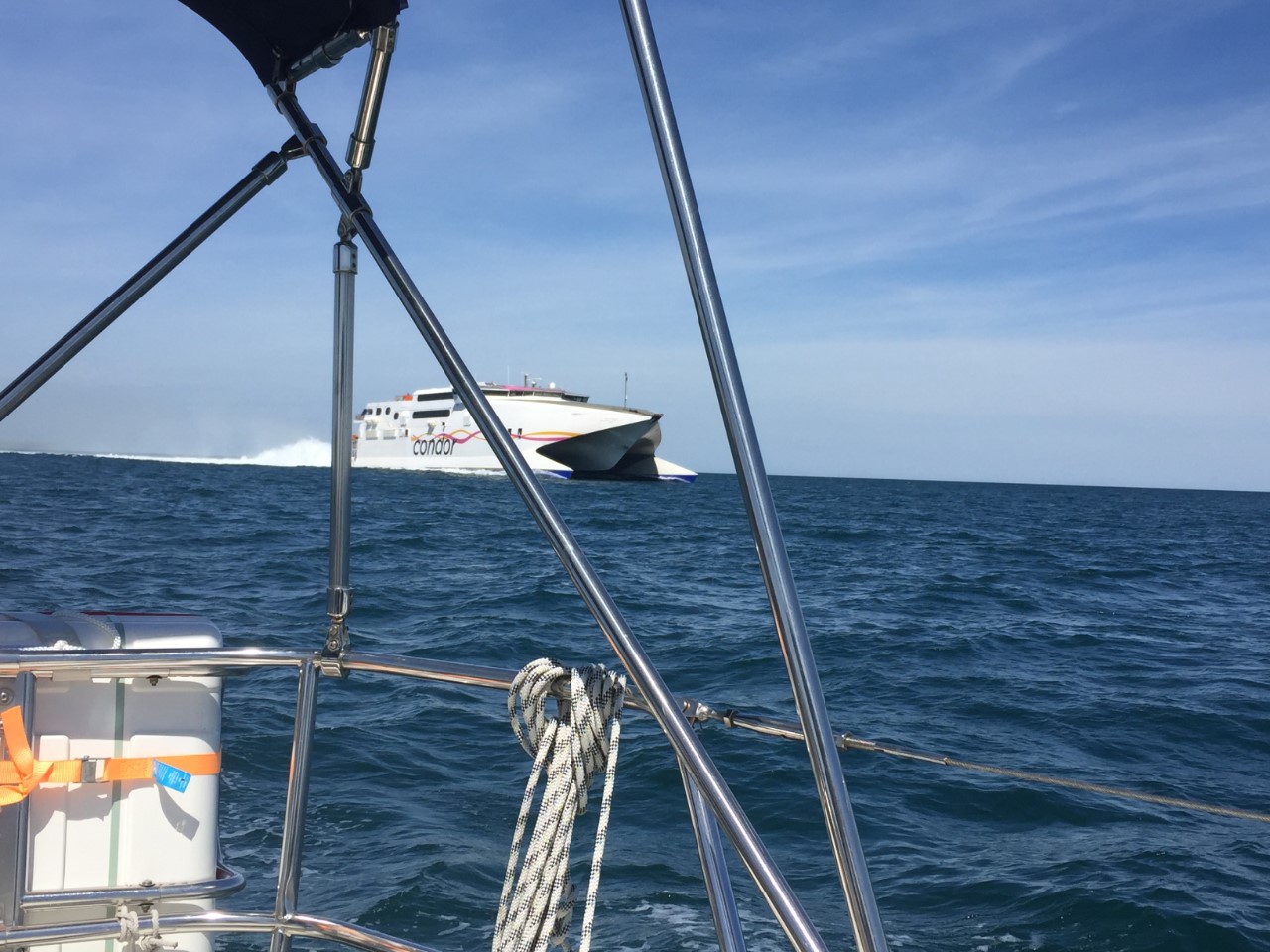 We gaan vertrekken naar Frankrijk vandaag. De vertrektijd is gunstig. Om 9:00 is het water boven de drempel hoog genoeg. Even na de haveningang hebben we de zeilen gehesen en met ruim 8 knopen laten we Jersey achter ons. En weer zagen we wat vinnetjes van dolfijntjes, maar ze hadden geen speelkwartiertje. Op ongeveer driekwart van onze tocht, vlakbij de Noord-Oost Kardinaal die de ondieptes aangeven van het Plateau Des Minquiers, kakte de wind helemaal in en hebben we de zeilen gestreken en de motor gestart. De stuurautomaat deed zijn werk en wij grepen af en toe in om de tonnetjes en wiervelden te ontwijken. Ook hebben we ons netjes aan de vlaggenetiquette gehouden en het Franse gastenvlaggetje gehesen. Even voor het indraaien tussen de groen/rode tonnen, die naar de haven toegingen, kwam op volle vaart de catamaran ferry op volle kracht op ons afstuiven. We hebben dat monster maar iets meer ruimte gegeven en als dank kregen wij golven van bijna 2 meter. In de haven waren alle bezoekersplaatsen netjes aangegeven met een bordje “visiteur”, dus hebben we een mooi plaatsje uitgezocht. We gingen direct naar het havenkantoor voor de formaliteiten. Ook hebben we ons gelijk aangepast aan de tijd, een uurtje later dan in Engeland. En Marianne ging een potje koken, karbonaatje, aardappeltje en spinazie, dat is lang geleden. Morgen gaan we naar St. Malo centrum. Niet met de fiets. Er is een probleempje in deze haven, want de loopbrug naar de kade heeft een te hoog stijgingspercentage.