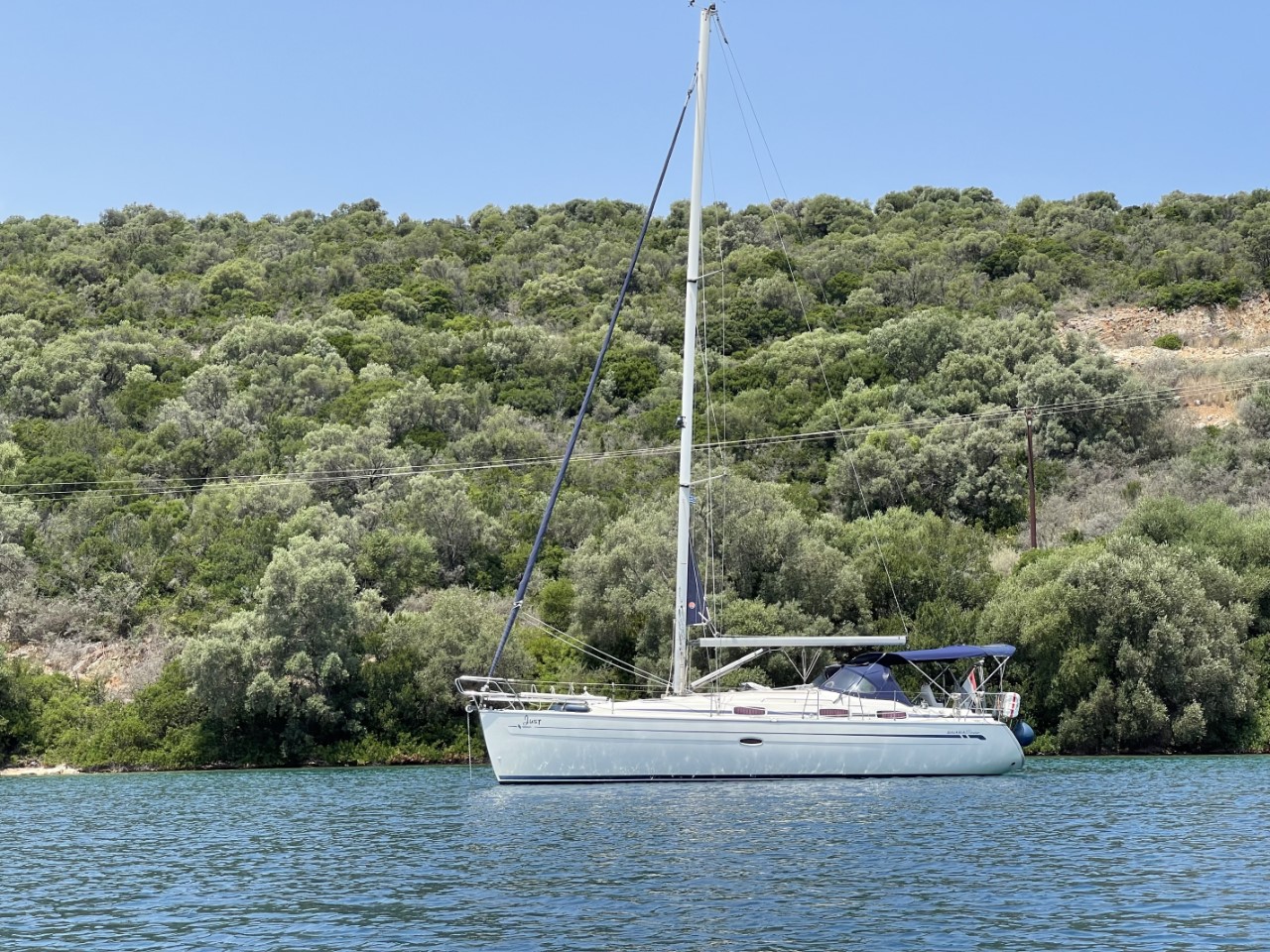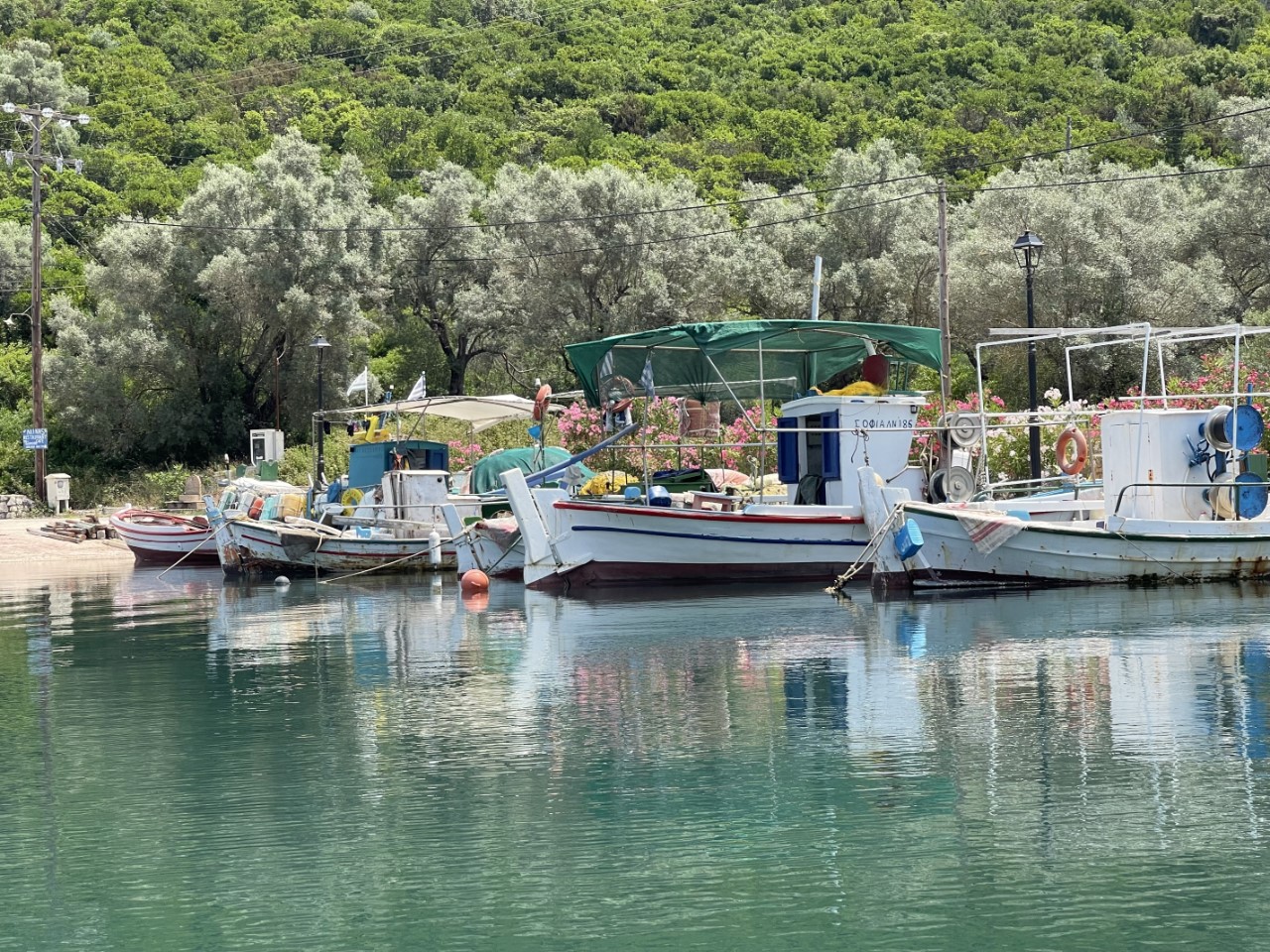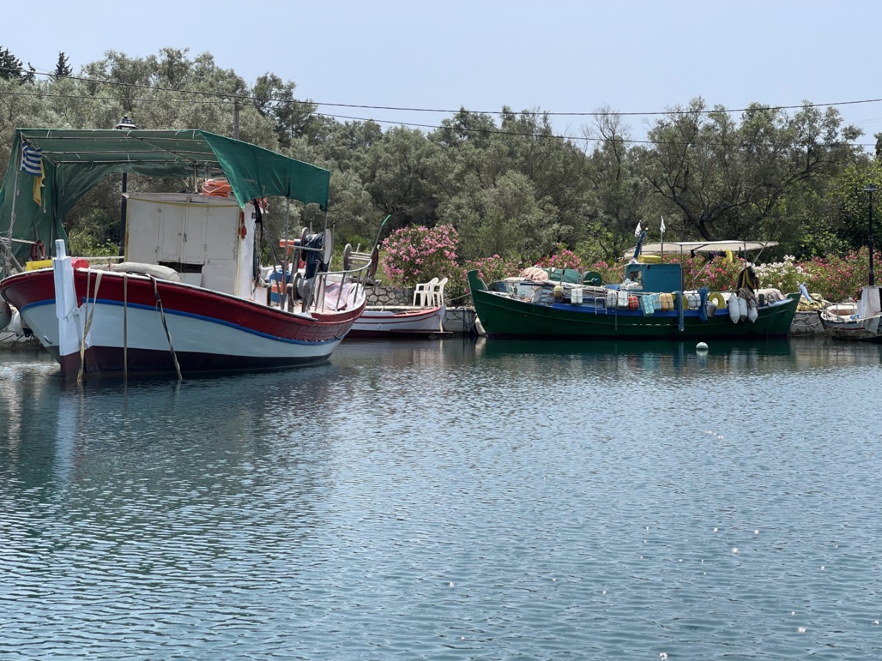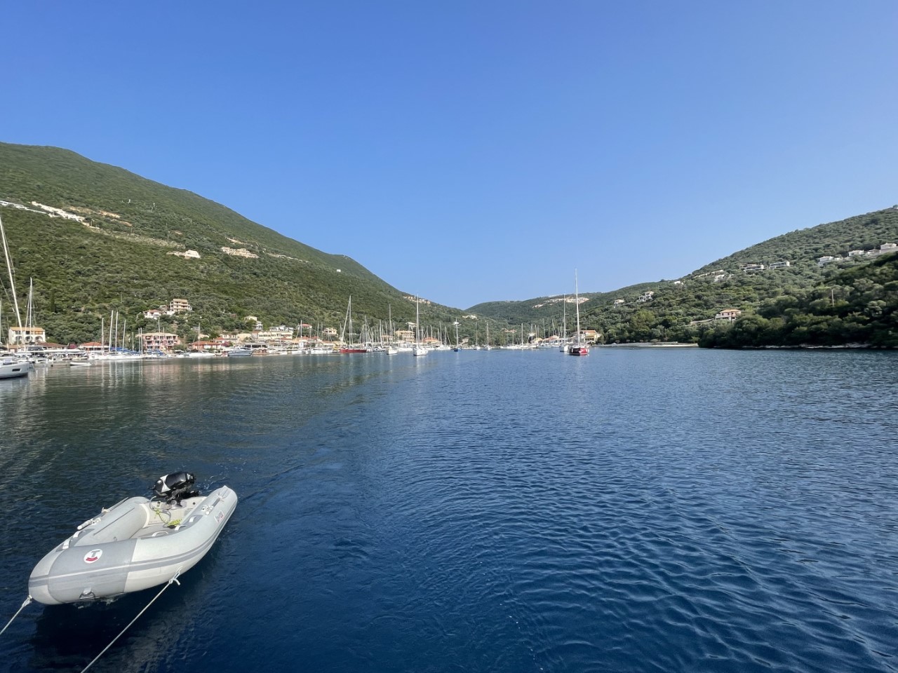 Na twee uurtjes komen we aan bij Meganisi. Elke baai die we tegen komen bekijken we en beoordelen via de Navily-app. De ene is te diep om goed te ankeren, de andere heeft een rotsbodem en soms is het veel te druk. Bij de zoveelste baai, die we invaren zijn al deze nadelen niet. We laten ons anker zakken op ruim 10 meter en kunnen ruim zwieren, omdat het lekker rustig is. Het was een goede keus om iets verder door te varen.