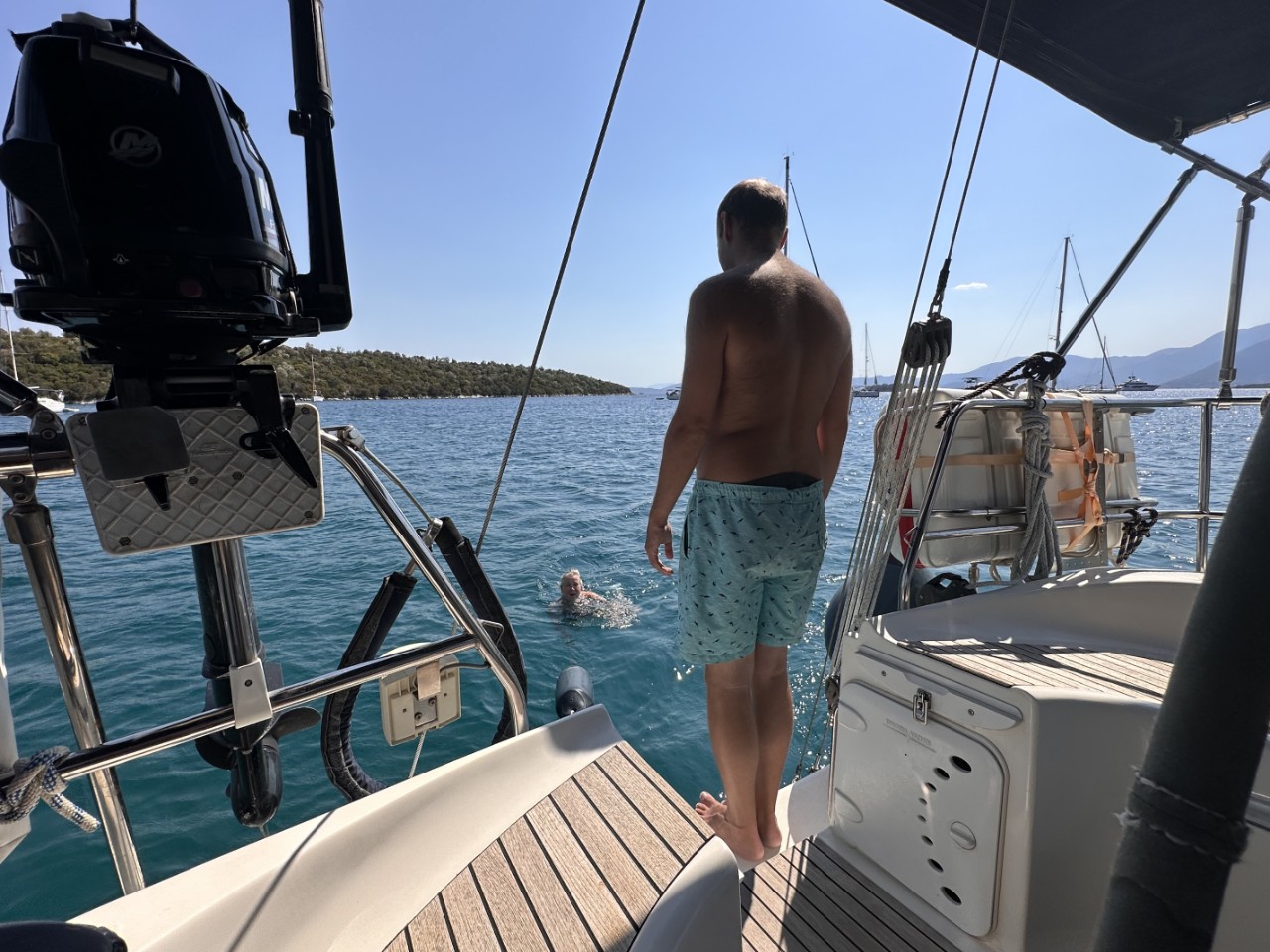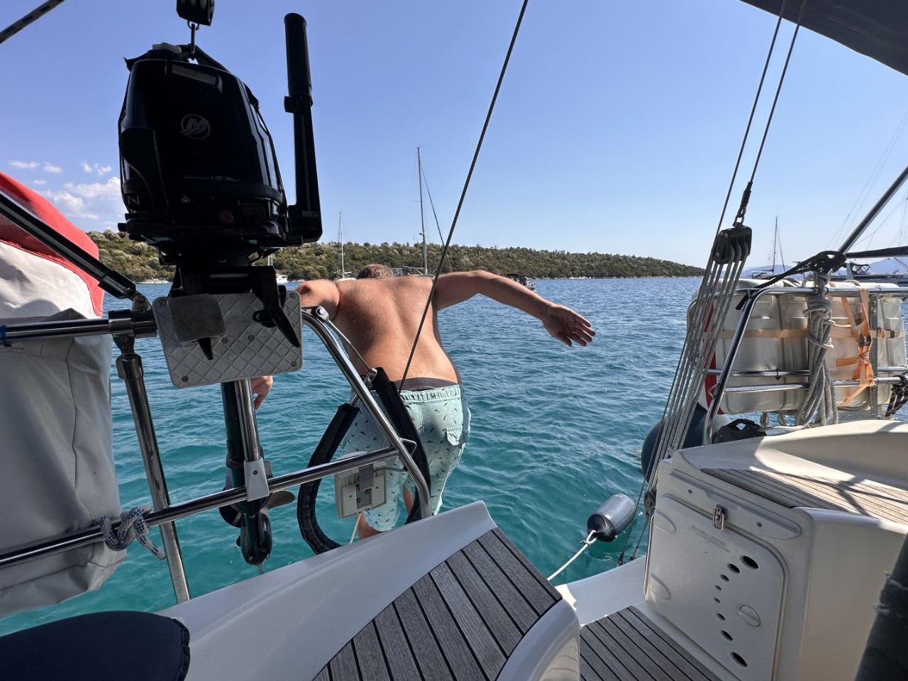 Na dit rustige ochtendje hebben we samen met de Engelse buurboot de trossen losgegooid. We hebben een mooi bezeilde tocht naar de baai van Varko. Bij het aanvaren lijkt het een drukke bedoening, maar we vinden een mooi plekje op 5 meter diepte vlakbij het strandje.