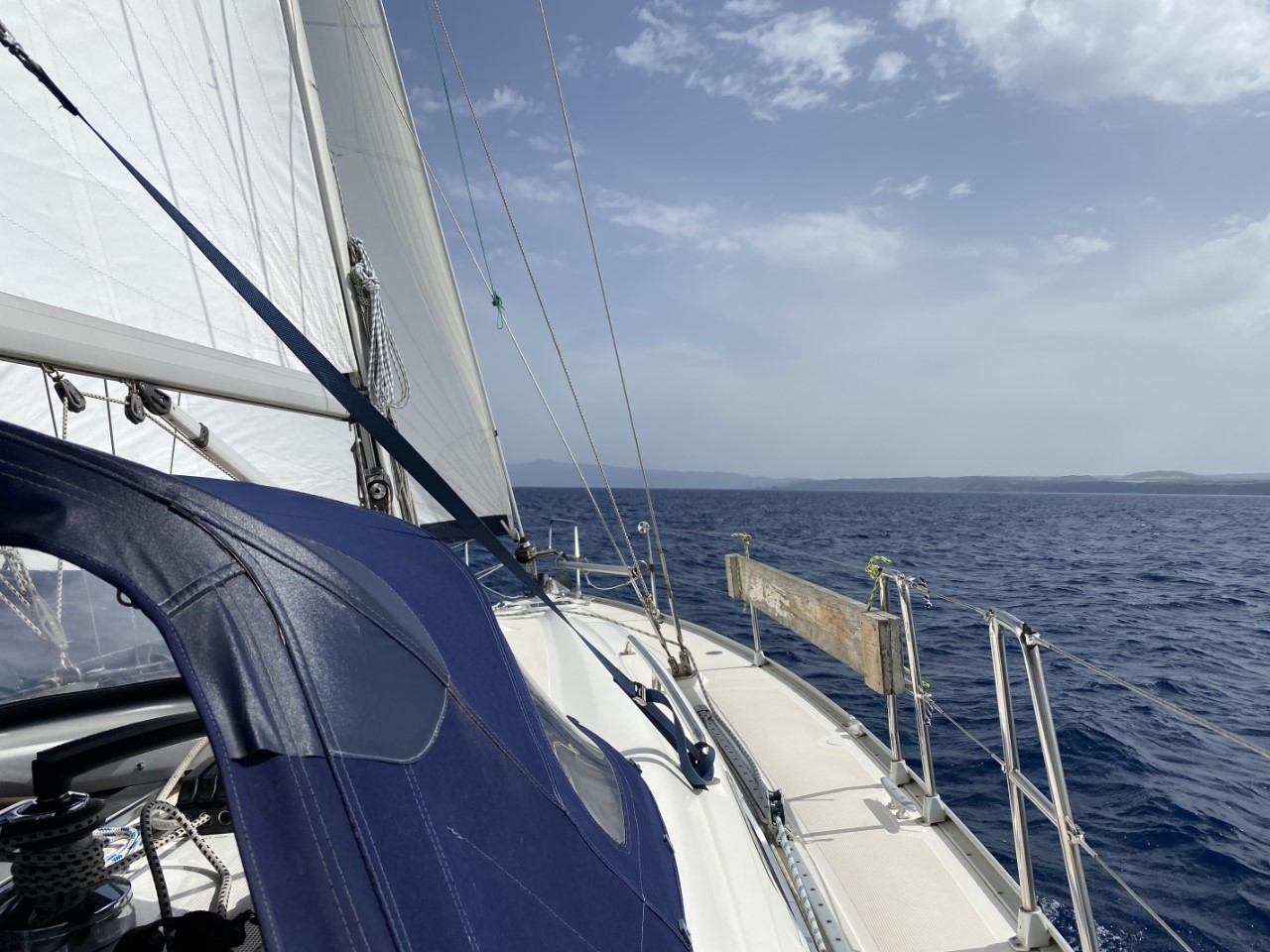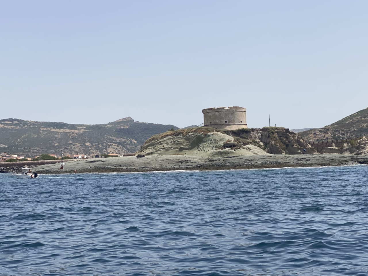 Twee uurtjes later ben ik opgestaan om de Just vaarklaar te maken. Marianne blijft nog even lekker liggen. Al snel zet ik de zeilen voor iets extra stuwkracht. De kustlijn verandert snel. Eerst een paar hoge rotsen en iets later hele lange lege stranden met veel camperparkeerplaatsen. Vlakbij Bosa zijn er dan weer hoge bergen. Ook is het een slalomtocht om de vele kleine vlaggetjes en jerrycans en plastic flessen voor de visfuiken te ontwijken. Niet normaal hoe slecht sommige te zien zijn.