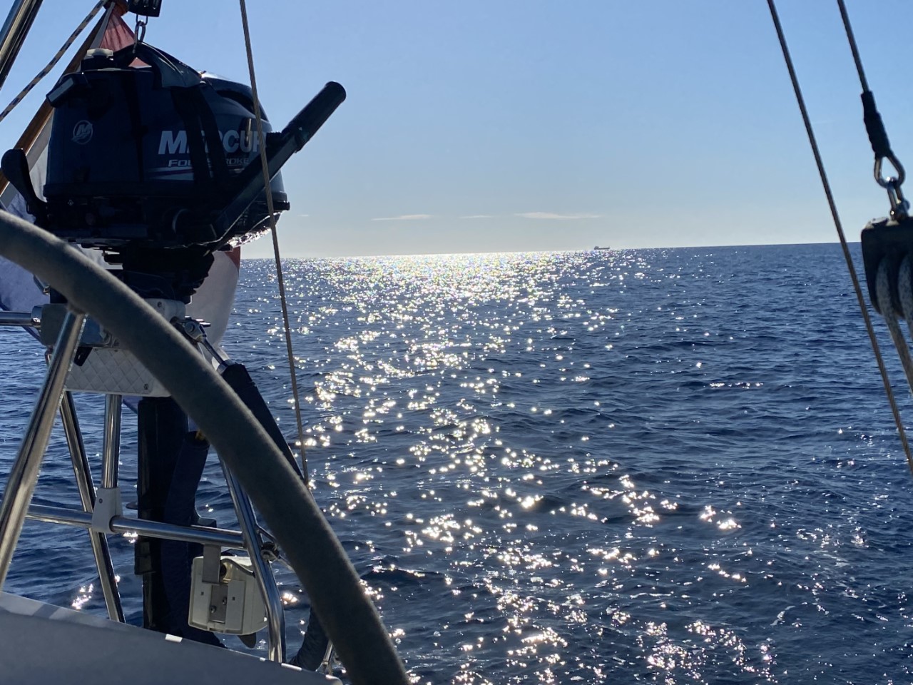 We vertrekken. Eindelijk. Het weer is redelijk stabiel. En voor ons eerste tochtje niet te veel wind. We vertrekken 03:30 uur uit een nog slapend Valencia de donkere zee op. We wisten al dat er veel aangroei op de romp en de klapschroef zat, maar dat het zoveel weerstand zou geven, dat hadden we niet verwacht. Met geen wind en op de motor gingen we maar net 3,7 knoop door het water. De verwachte aankomsttijd van 21:00 uur liep op naar 02:30 uur, wat een tegenvaller. En toen we ook nog een gek luchtje roken in de voorkajuit liepen we nog meer te balen.