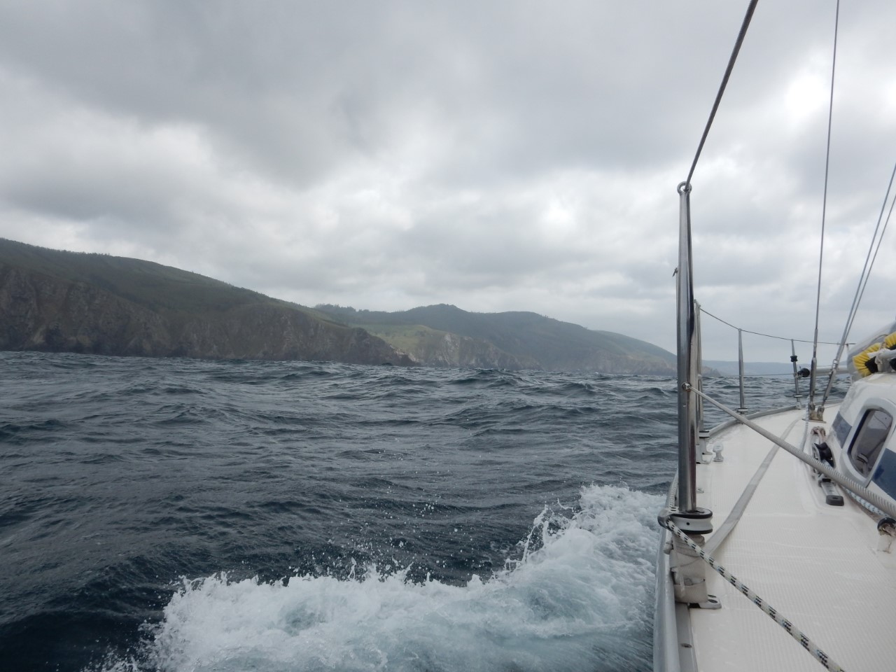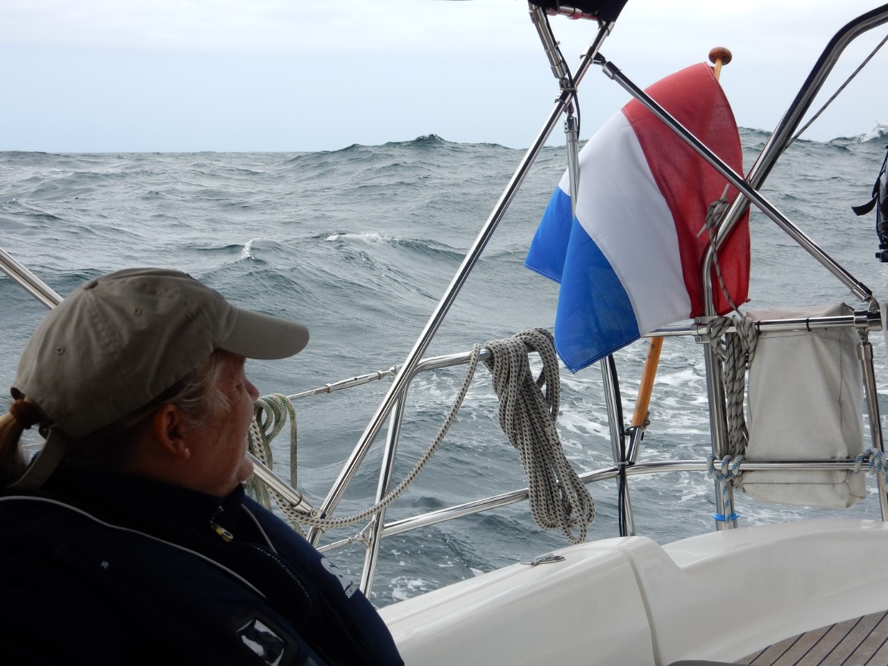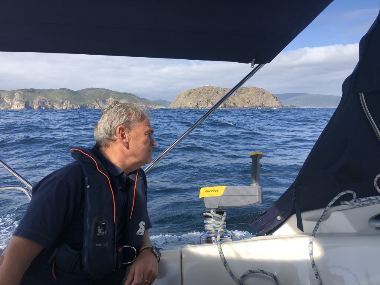 Even het dek afspuiten, de watertank vullen en de laatste boodschappen halen. We zijn klaar voor vertrek om twee dagen te gaan ankeren in een Ria. De weersverwachting voorspelde in de middag een ruime 25 knopen wind, maar we hadden het wel gezien in Viveiro. Tot Punta Estaca de Bares, het meest Noordelijk stukje van Spanje, hadden we een goede halfwindse koers. Maar na het ronden van de Punta gingen we weer voor de wind en hebben het grootzeil ingedraaid. De golven die op ons inliepen waren indrukwekkend hoog en we werden dan af en toe flink door elkaar geschud. De wind nam, zoals voorspeld, toe met als uitschieter 31 knopen. We haalden af en toe snelheden van 7,3 knopen. We hebben deze westelijke koers zolang mogelijk aangehouden om daarna een halfwindskoersje naar het zuiden te maken en de ingang van de Ria te hebben. Aangekomen in de Ria nam de wind iets af en vonden we een mooi ankerplekje. We hadden ruime keus tussen de andere twee zeilboten. We hebben foto’s van deze Ria gezien, waar het propje vol lag. Wij hebben lekkere pittige kip met rijst gemaakt en gaan voor de komende dagen in relaxstand.