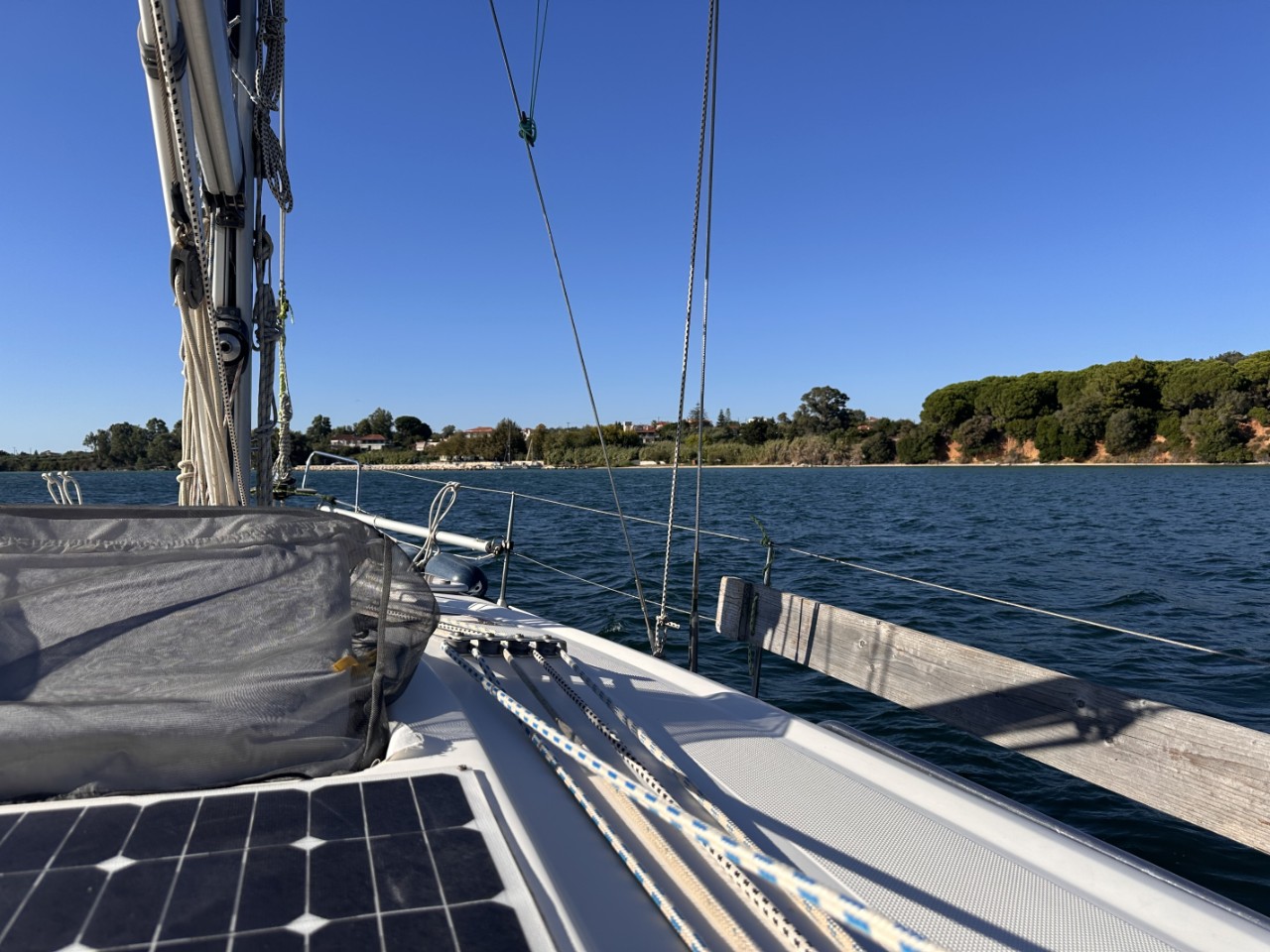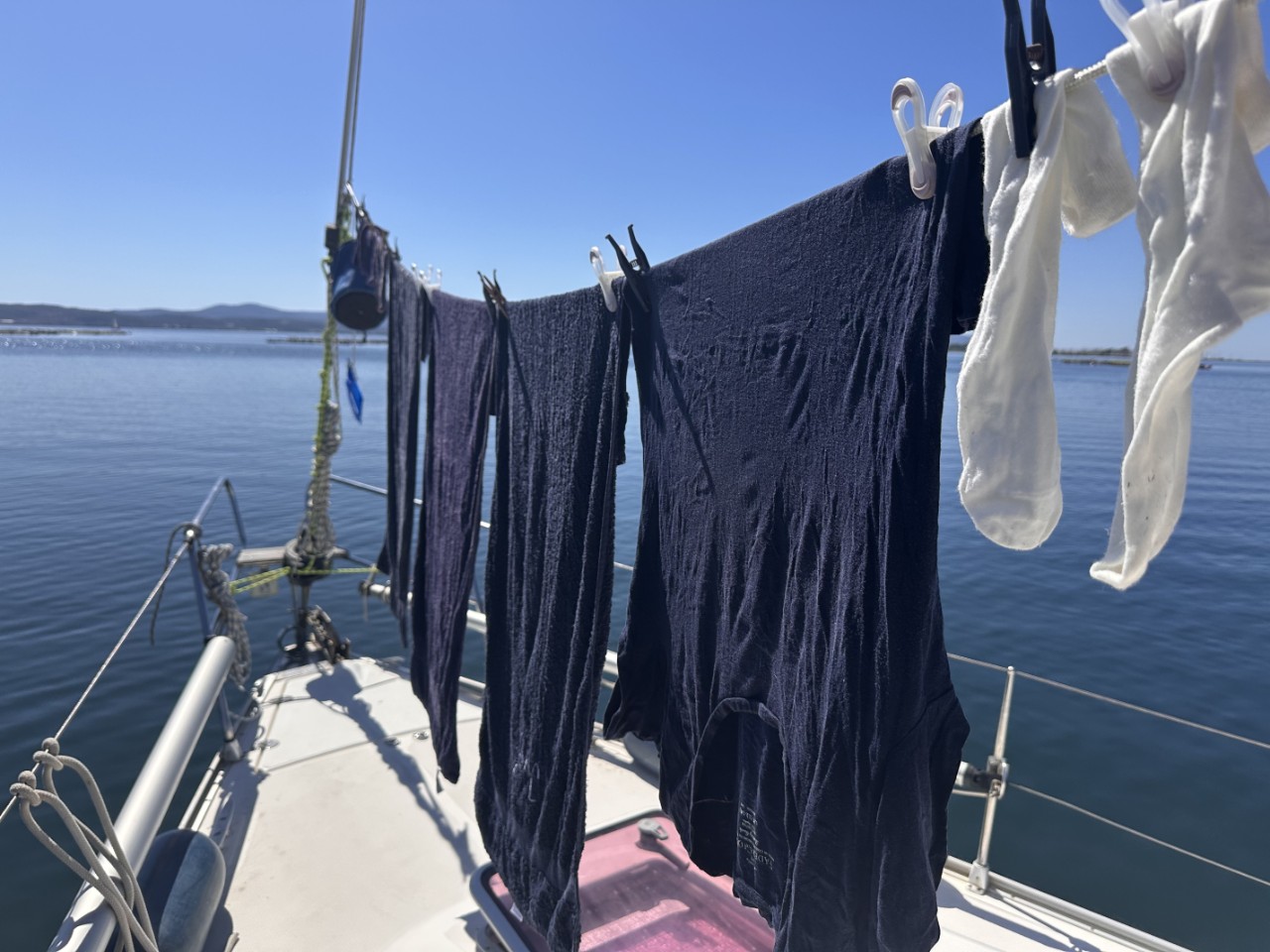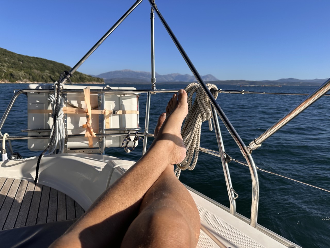We varen voorbij een bijna verlaten baaitje en kijken op de Navily-app, hoe daar de reviews zijn. We vinden het wel wat en veranderen van koers. Het ligt op een halfuurtje varen afstand van onze bestemming. Er liggen twee andere zeilboten ruim uit elkaar en we droppen ons anker op ruime afstand van de anderen. We vinden het een prima plekje en stukken beter dan de drukkere ankerplaats achter de haven van Preveza. Het is vandaag rustig weer, met de middagwind die ongeveer 18 knopen is. Voor de nacht is het een klein briesje. Goed om te ankeren.