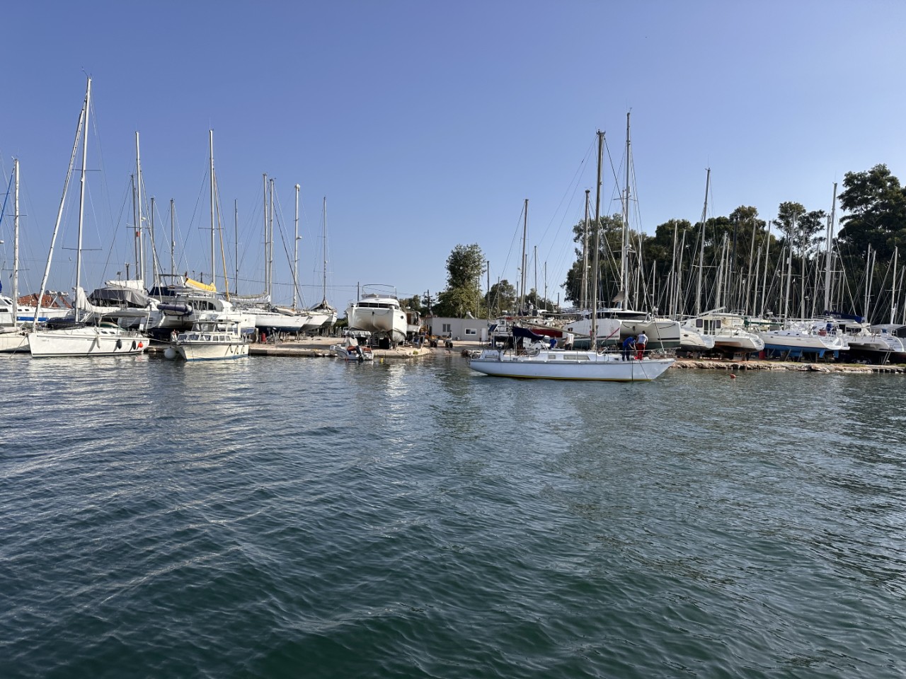 We kunnen maar een klein stukje zeilen, want de wind is weer nergens te bekennen. Voordat we in de baai een ankerplekje gaan uitzoeken, varen we even door naar de werf, waar de Just voor de winter de kant opgaat. Het is veel kleinschaliger dan onze vorige winterplaats, maar op zich lijkt het er prima uit te zien. Daarna zoeken we zoals steeds een ruim ankerplekje.