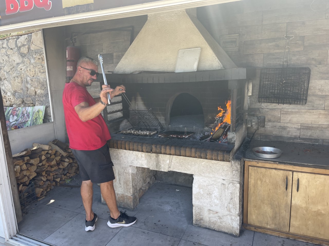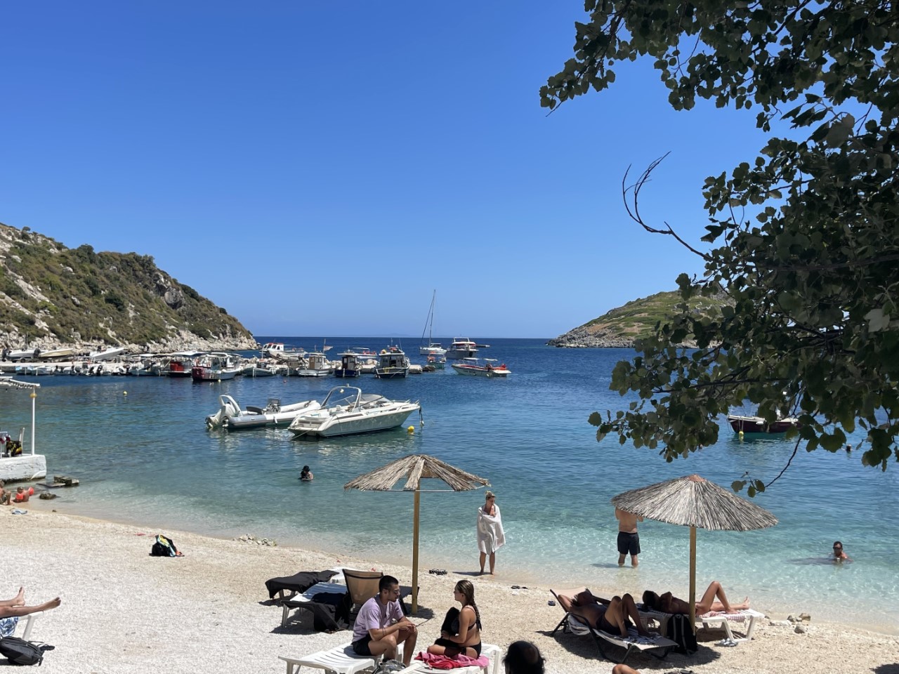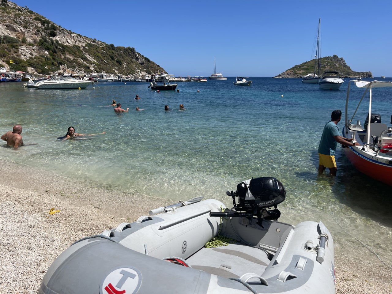 Tegen 14:00 uur gaan we met het bijbootje op zoek waar we die kunnen aanleggen. Niet dus, die parkeren we op het strand naast de huurbootjes. De Griek vindt het prima en helpt ook nog met het op het strand trekken. We werden tijdens het aanleggen van de Just aan de boei uitgenodigd om bij het familierestaurant te komen eten, maar dat zat helemaal vol en we zoeken iets verder. We hebben het idee, dat alles wat op de kade te vinden is van één familie is. Dat kan ook bijna niet anders met maar 50 inwoners.