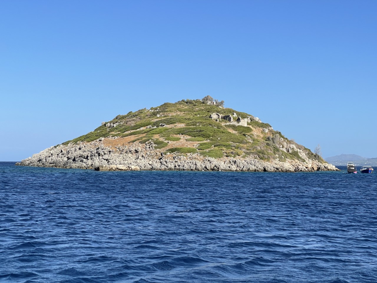 Het is een pittig tochtje. We hebben flink wind tegen en hoge golven. Een half uurtje voor aankomst bellen we met Costas, die de mooringboeien regelt. Daar kiezen we voor, omdat we dat liever hebben dan aan de stadskade met deze wind, met als bijkomend voordeel dat het gratis is.