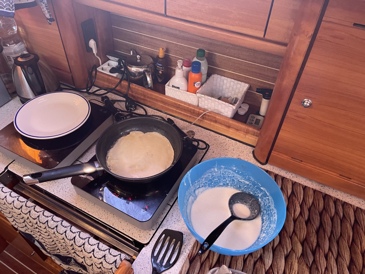We hebben lekker gegeten en een paar laatste boodschapjes kunnen halen op Zakynthos. Als toetje hebben we in de avond lekker Hollandse pannenkoeken gebakken, helaas zonder Zeeuwse stroop. Morgenochtend bezoeken we nog de Blauwe Grotten en varen dan door naar Kefalonia.