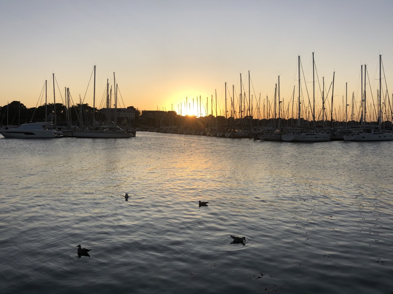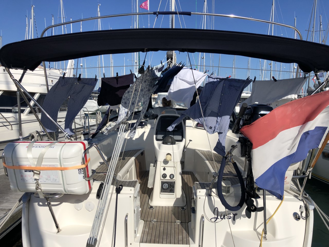 Zoals verwacht staat er nog steeds veel wind. Maar geen nood er moet gewassen en schoongemaakt worden. Wij zijn in de ochtend een uurtje door de Just gegaan en een paar wandelingetjes naar de wasmachine en droger. Tegen de middag was de klus geklaard. We hadden al besloten om een dagje te blijven in de haven. Ondanks de harde wind was er geen gebrek aan een zonnetje. Dus de kussens gingen op de kuipbanken en wij maakten ons op voor een middagje niks doen. Een boekje, een stuk sticky toffee cake en een drankje, wij komen de middag wel door. Als we naar de weersverwachting kijken voor de komende dagen blijft het waaien, wat doen we dan? Morgen is er wel even iets minder wind in de middag, misschien gaan we dan naar Le Crouesty. Maar hier blijven is ook geen straf. Ik zou wel kunnen wennen om hier te wonen, jammer van al die Fransen. Na ons maaltje zijn we even het havenhoofd opgelopen om het woelige water in de Baie de Quiberon te bekijken. Zo hebben we toch nog iets beweging vandaag. We ploffen na deze wandeling samen op de kajuitbanken met filmpje.