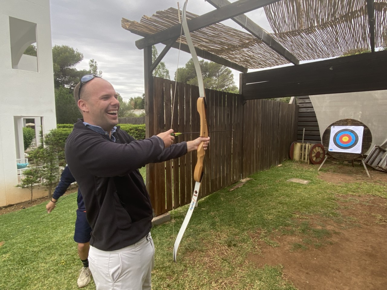 Mark werd uitgenodigd voor pijl en boog schieten. Er waren 4 rondes, steeds iets verder van het doel en als laatst moest er op een appel geschoten worden. Dat leverde de meeste punten op. En de winnaar van het toernooi was Mark, die met een fles Cava beloond werd.