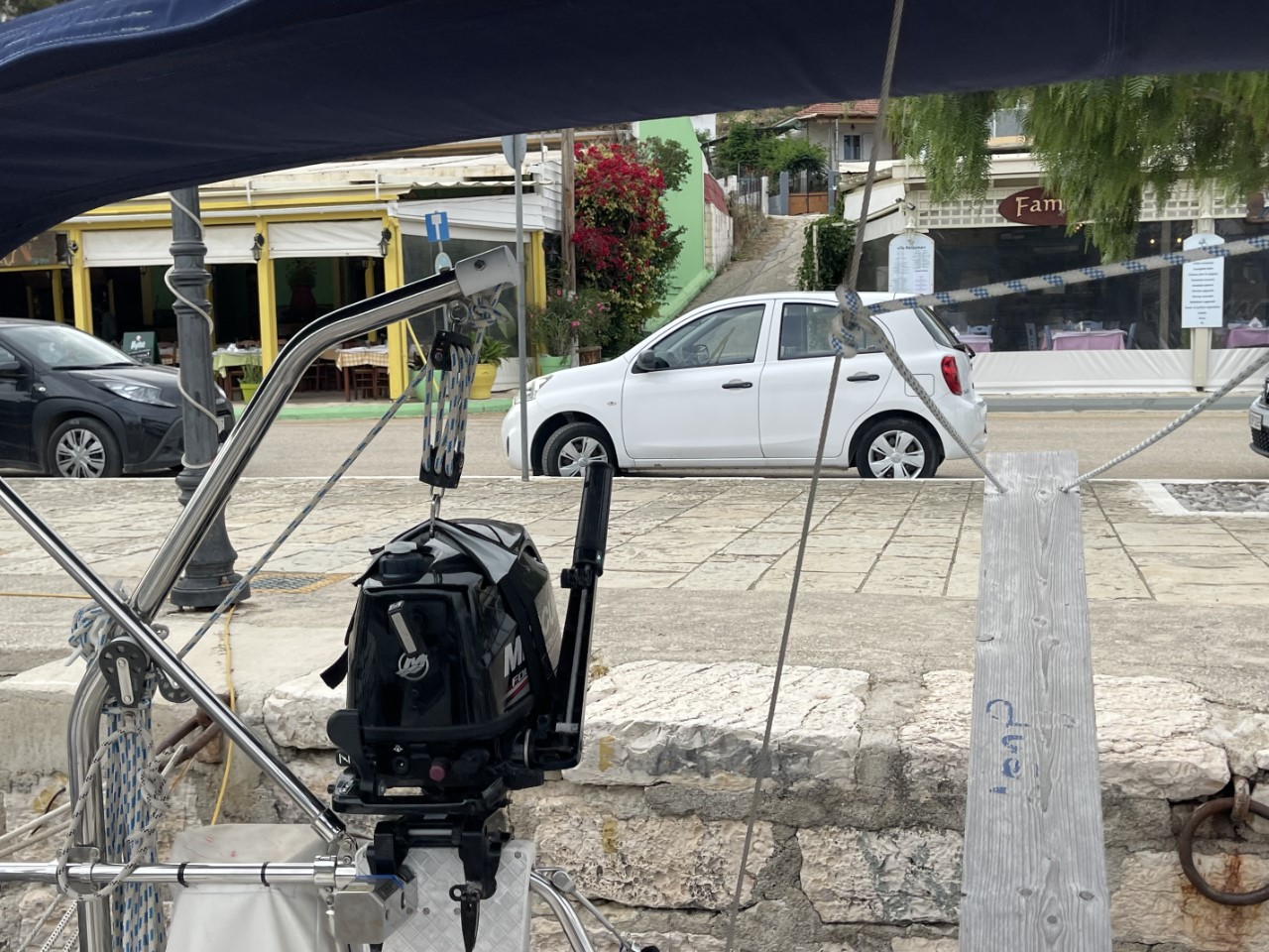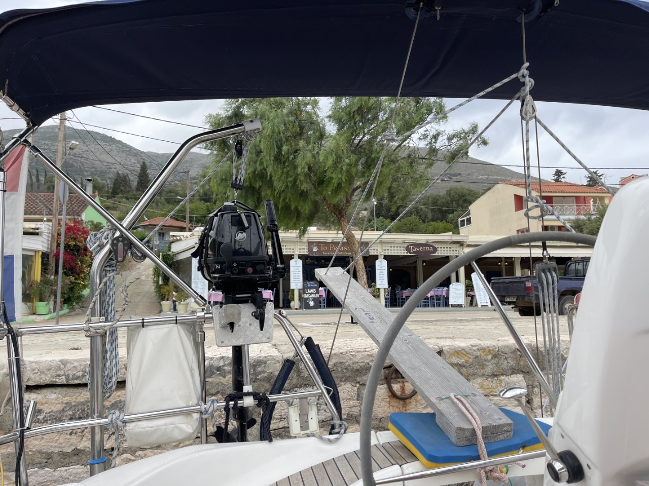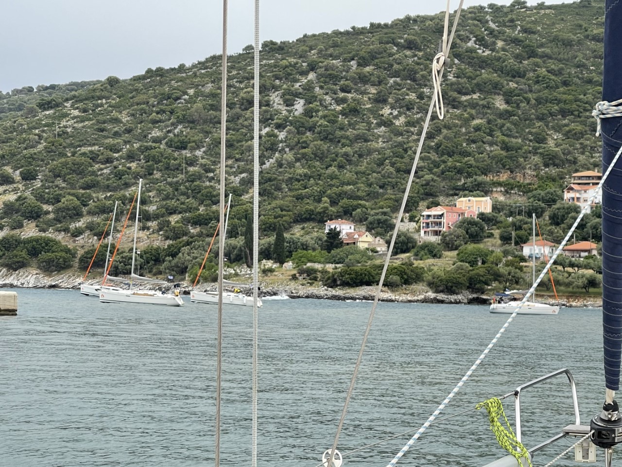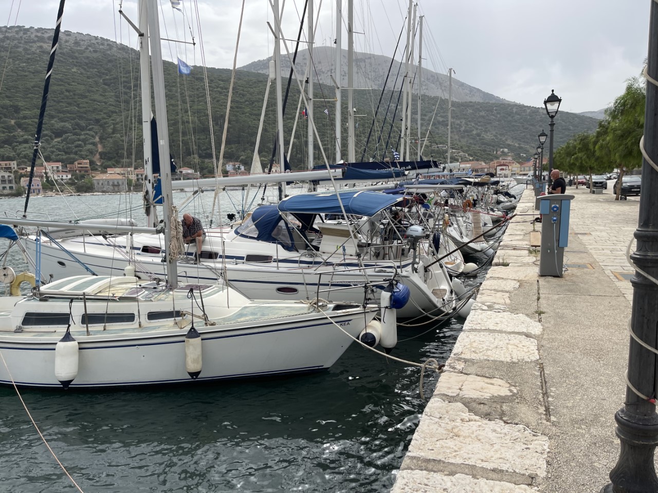 Ik ga om 17:00 uur even snel onze huurauto ophalen, die we morgen nodig hebben om Mark van het vliegveld te halen. Het is een hele toer om via het smalle loopplankje van boord te komen. We zijn net klaar met ons avondmaaltje als Marianne ziet dat de ankerketting van onze bakboord-buren bijna verticaal naar beneden hangt en dat er geen spanning op staat. Ik waarschuw de buren en die vinden het maar niks om hun ankerketting iets in te halen, omdat ze bang zijn dat ze dan helemaal geen houvast meer hebben. Het advies van de havenmeester is, haal het anker op en vertrek naar Sami. Dit is een haven een paar mijl hier vandaan. Daar zijn de omstandigheden stukken beter. Tijdens het losgooien van de lijnen trekt het zware zeiljacht één van de stalen ringen uit de kade. Ook wij liggen vast aan die ring en nu ligt onze bakboordkant helemaal los. Met behulp van de havenmeester die erbij staat, liggen we ook weer snel vast aan een stevig paaltje. Het ophalen van het anker van onze buren gaat heel langzaam, er lijkt iets mis met zijn ankerlier. Wij zijn al die tijd bang, dat ze ons anker ook mee ophalen. Ze zouden de eerste niet zijn. Gelukkig krijgt hij na een hele tijd zijn ankerketting ingehaald en liggen wij nog steeds stevig. De wind is om 21:30 uur wel iets aan het afnemen. Nu is het wachten dat ook de golven in de havenkom iets minder gaat worden. Voorlopig wisselen we elkaar af in het kuipje om de situatie in de gaten te houden. We hopen vannacht nog iets te kunnen gaan slapen.