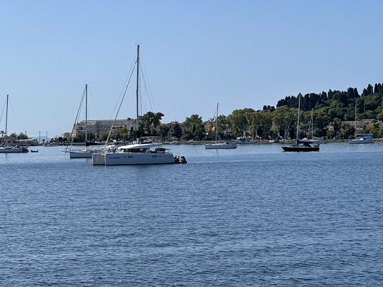 Het was een beetje een hobbelige nacht achter ons anker. Het is weer even wennen na een paar dagen resort en haven. Vandaag gaan we de Lidl bezoeken in Corfu-stad. Bij een andere Nederlandse boot informeren we, waar we het beste ons bijbootje achter kunnen laten. We worden naar de haven verwezen, waar we een perfect plaatsje vinden. Na een kleine wandeling vinden we de Lidl, waar we na een uurtje met volle rugzakken en tassen uitkomen. Onder een brandend zonnetje hebben we het bijbootje opgezocht. Alle boodschappen krijgen een plaatsje en de voorraad is weer aangevuld.