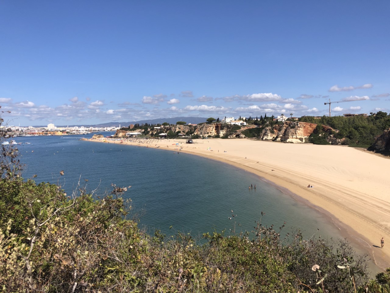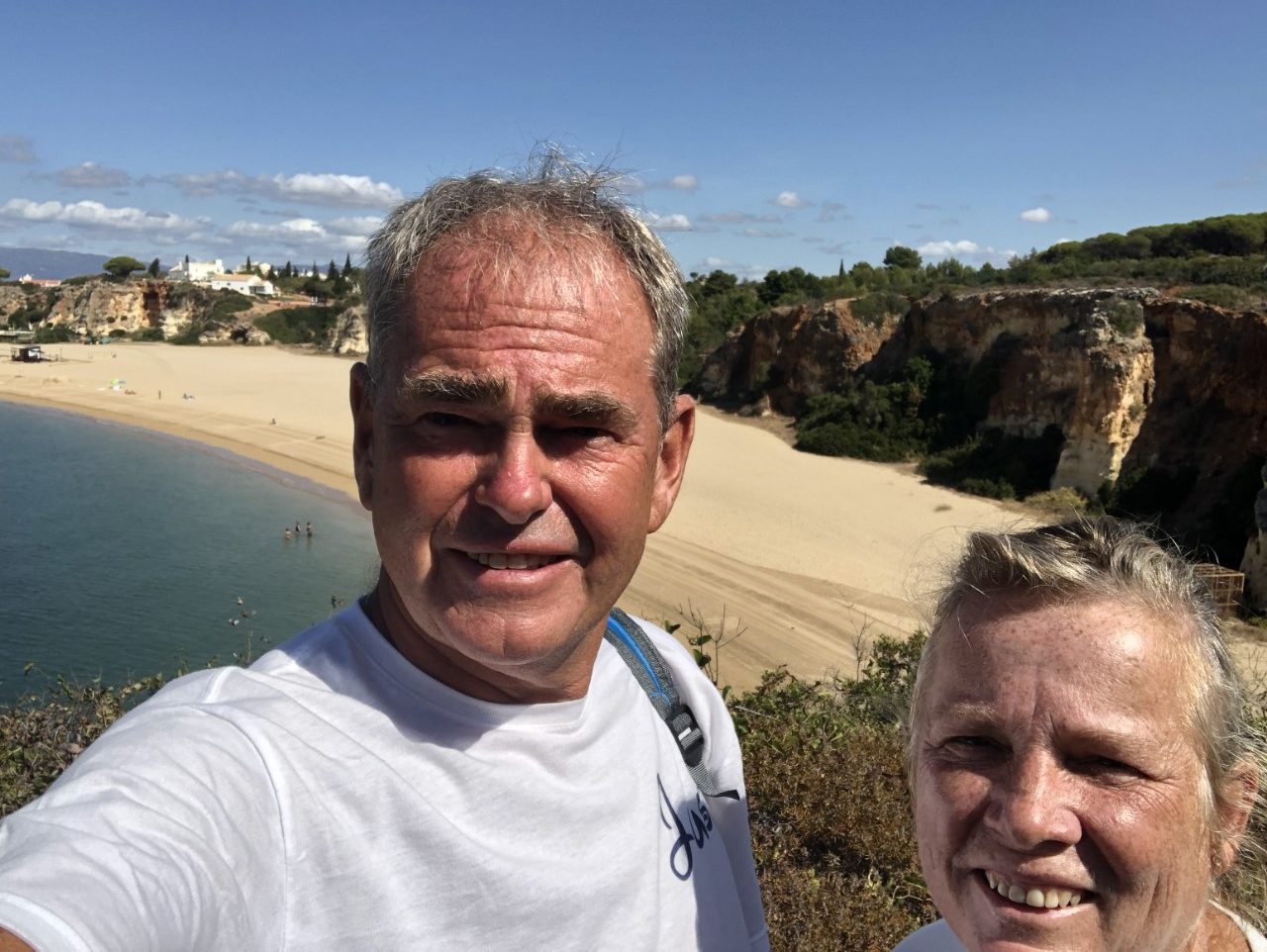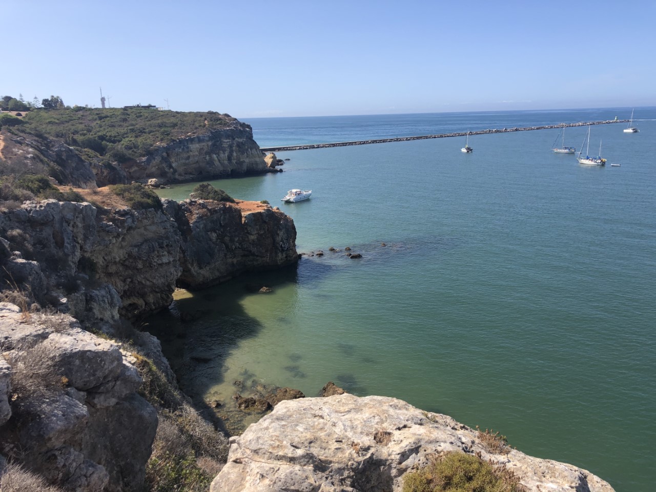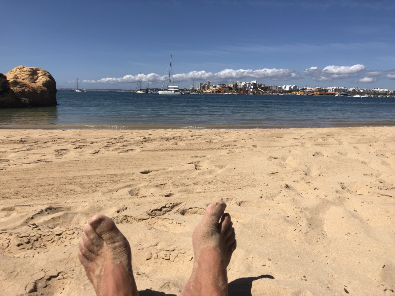 Wij gingen ook iets Oostwaarts varen, maar dan met de rubberboot richting strand. We hebben de rubberboot gezekerd aan een paaltje en gingen de steile trap op. We stonden al snel heel hoog en hadden een mooi uitzicht over onze ankerbaai. Het pad naar de vuurtoren was wisselend omhoog en omlaag. Om bij de vuurtoren te komen moesten we eerst weer op strandniveau lopen en dan weer eens flink omhoog. Wij vonden dat laatste stuk best en zijn terug gewandeld naar het strand, waar we een uurtje hebben liggen zonnen. De zon deed goed z’n best en we zijn terug naar de Just geroeid om lekker onder de bimini verder te genieten. En weer te overleggen. Er komt een flinke wind aan en de kans zit er in dat wij daar vrijdag een staartje van mee kunnen genieten. We willen dan wel een goed, veilig en beschermd ankerplekje hebben, al is er ook een kans dat die langs de Westkust van Portugal richting Lissabon trekt en het allemaal meevalt. De vergadering is teneinde, we zijn er uit, bij Faro is een soort lagune, daar hebben we denken wij voldoende bescherming en het schijnt er prachtig te zijn, dus twee vliegen in één klap.