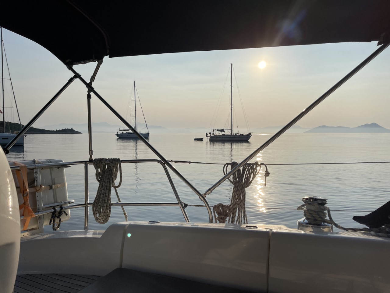 Gisteren werd het in de loop van de middag superdruk in deze ankerbaai, maar vandaag is het heel rustig. Tegen de avond komt de Rhea, een groot zeiljacht met Nederlandse vlag op vol zeil aanvaren. Ik denk een mooie foto te kunnen maken, als dit schip voorbij ons bescheiden zeilbootje langs komt. Op prachtige wijze strijkt het echter de zeilen en gaat op zoek naar een ankerplekje een stukje verder van onze ankerbaai.