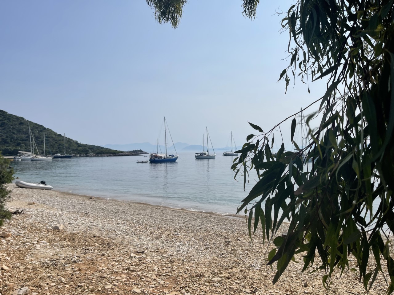 Al vroeg hakken we de knoop door, we blijven. Het is hier een schitterend ankerplekje. We besluiten om naar Frikes te wandelen, vanaf hier iets meer dan 3 kilometer. Een uitdaging, we moeten 87 meter bergop en 93 meter bergaf, dus we vertrekken vroeg. Het wordt iets later, want een buurboot vertrekt en we verplaatsen nog even de Just een kleine 20 meter. Ik controleer ook nog het anker en dan pakken we het bijbootje naar het strandje.