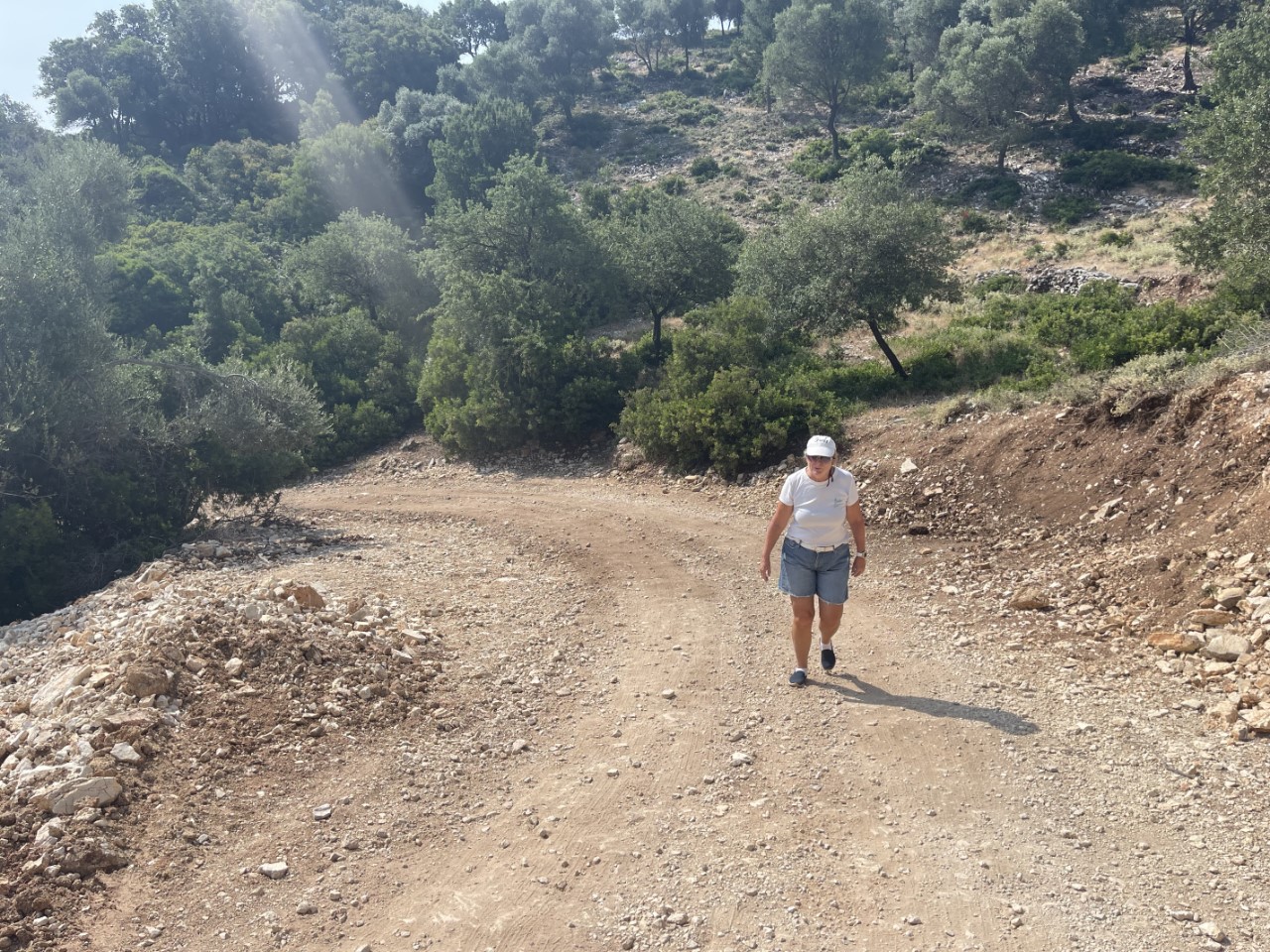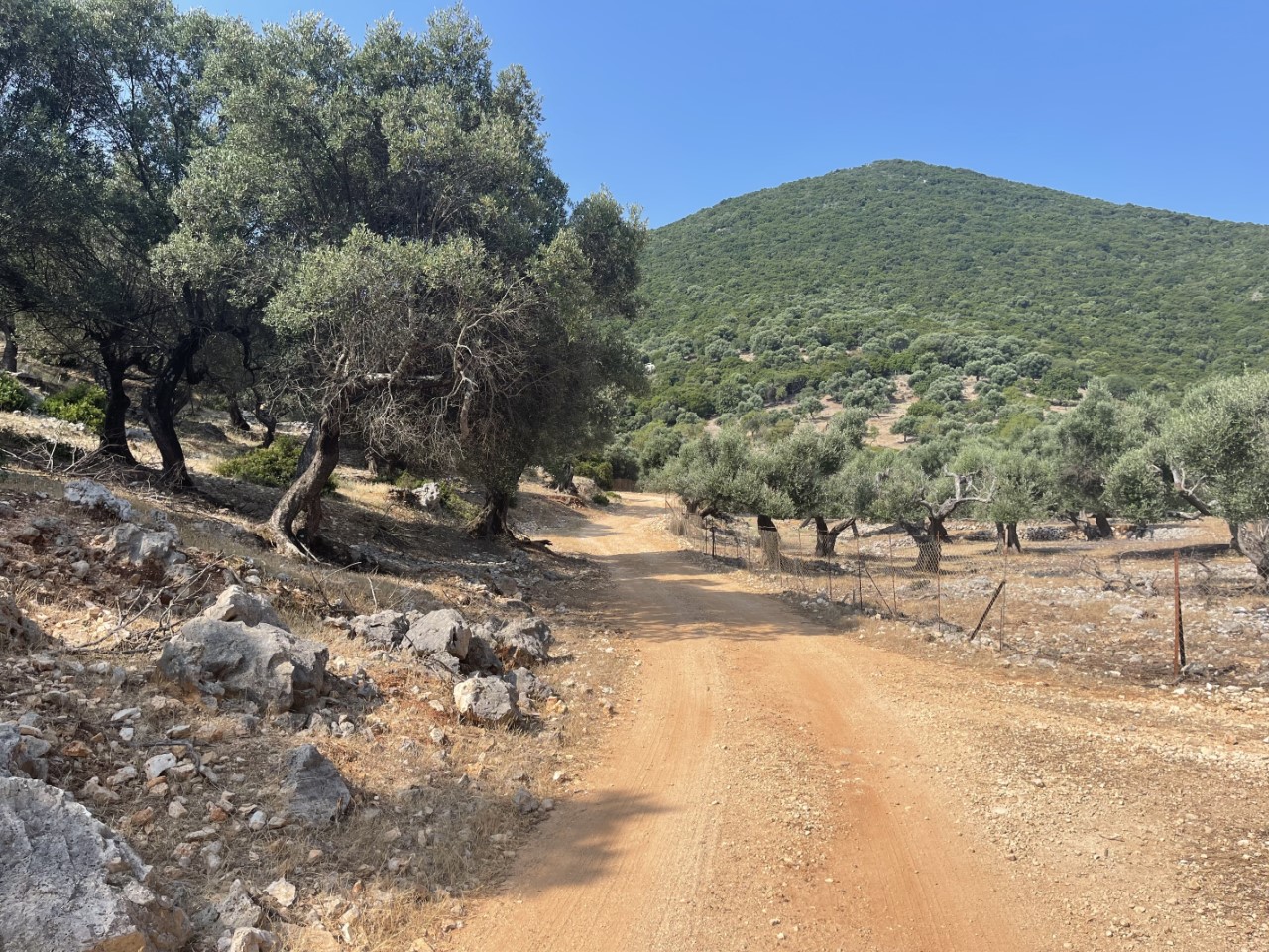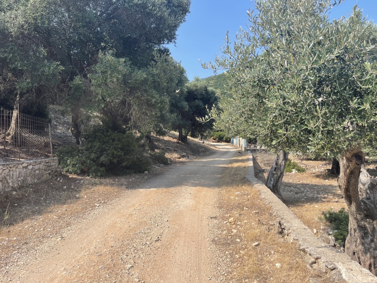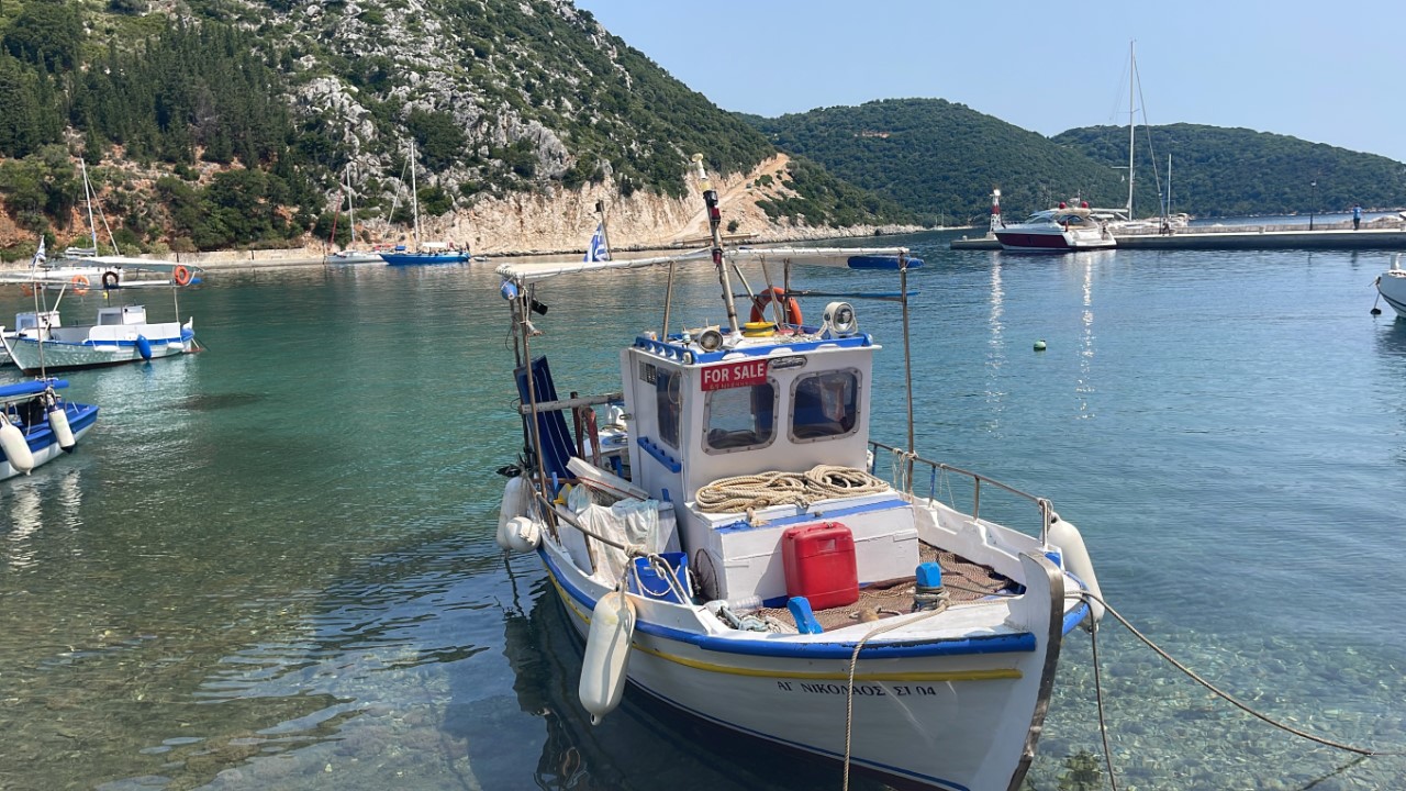 De wandeltocht is mooi met veel olijfbomen over een rotsachtige weg met steenslag, maar het is heel pittig. Het zonnetje op land geeft een gevoelstemperatuur van tegen de 50 graden, denken wij. Frikes is een heel rustiek dorpje met een ronde havenkom met Griekse bootjes en wat zeiljachten, een dertigtal huizen, drie terrassen en een hele kleine supermarktjuwelier. We ploffen gelijk neer op het eerste terras voor iets koels en om even uit te rusten. We kijken nog even naar een te koop staand huisje en een te koop liggend vissersbootje om ons daar te vestigen, maar dat idee is van korte duur. Al heel snel hebben we alles gezien en beklimmen de berg weer.