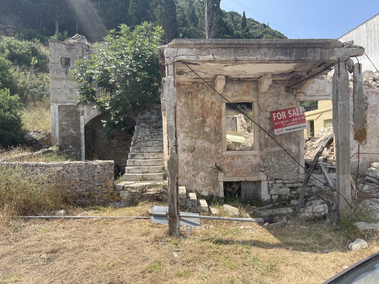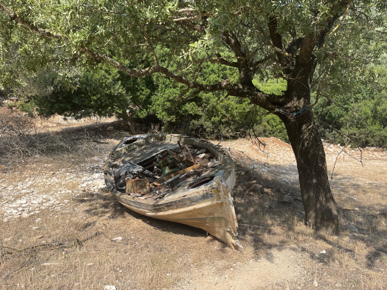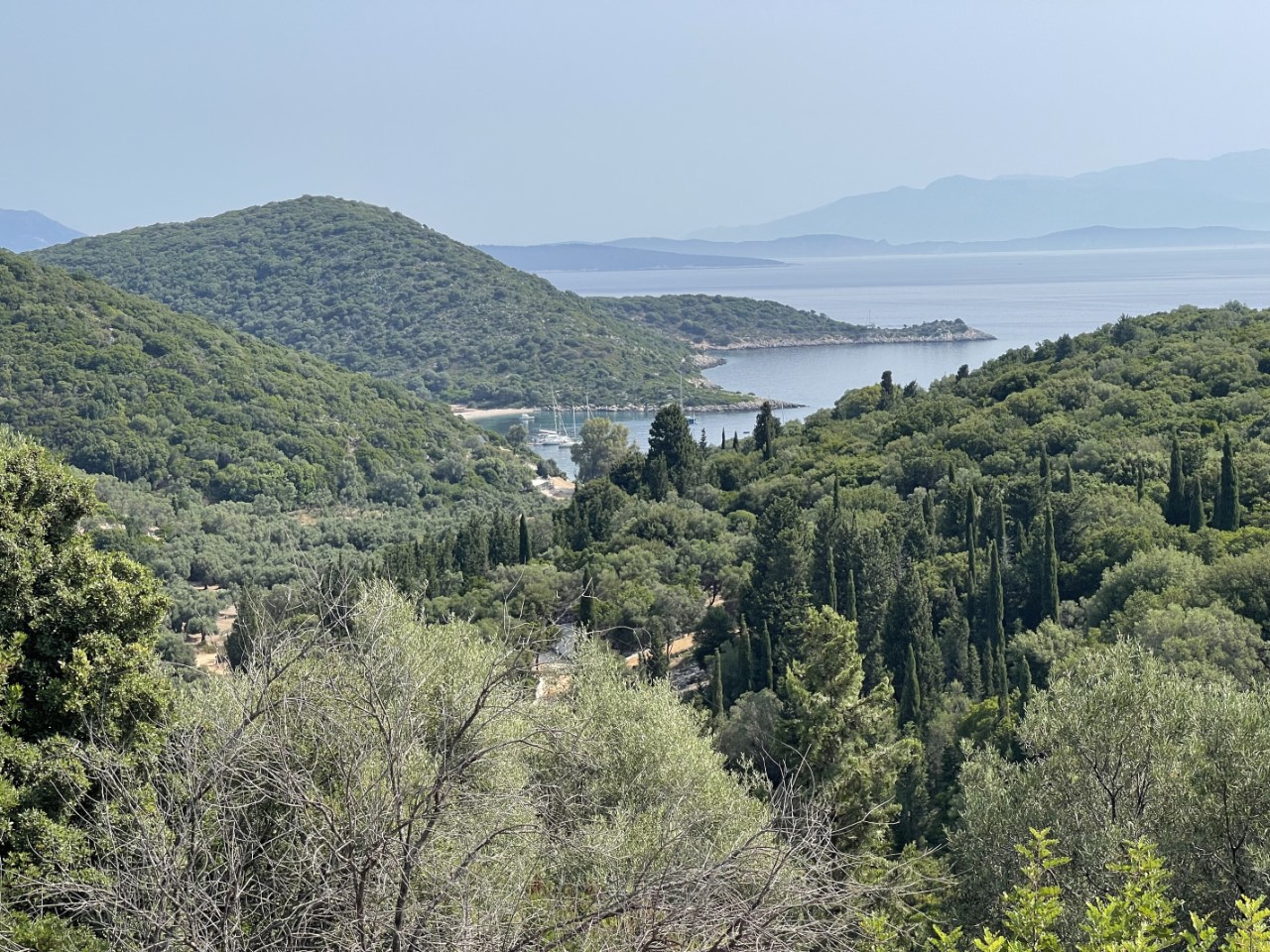 De wandeltocht is mooi met veel olijfbomen over een rotsachtige weg met steenslag, maar het is heel pittig. Het zonnetje op land geeft een gevoelstemperatuur van tegen de 50 graden, denken wij. Frikes is een heel rustiek dorpje met een ronde havenkom met Griekse bootjes en wat zeiljachten, een dertigtal huizen, drie terrassen en een hele kleine supermarktjuwelier. We ploffen gelijk neer op het eerste terras voor iets koels en om even uit te rusten. We kijken nog even naar een te koop staand huisje en een te koop liggend vissersbootje om ons daar te vestigen, maar dat idee is van korte duur. Al heel snel hebben we alles gezien en beklimmen de berg weer.