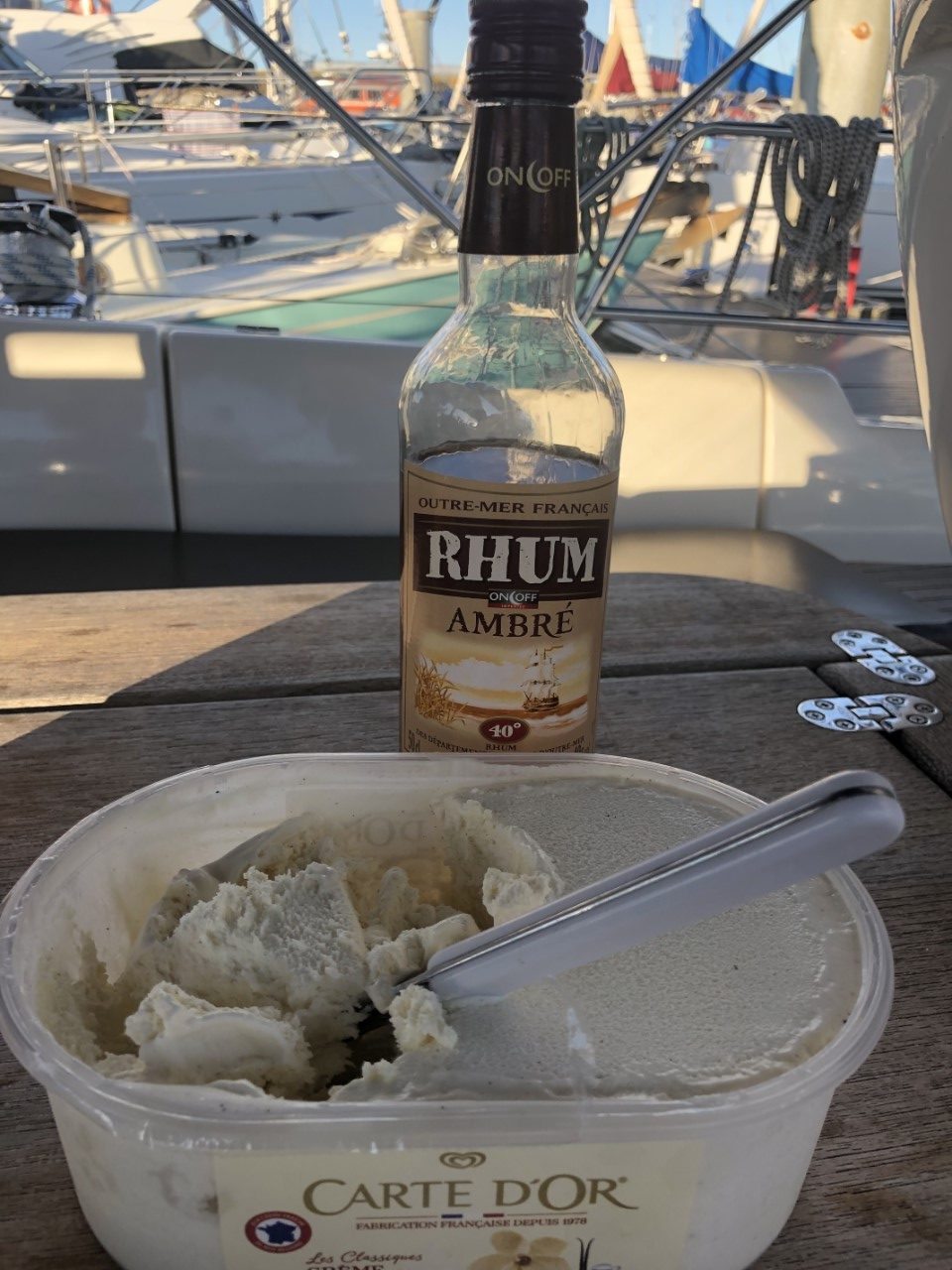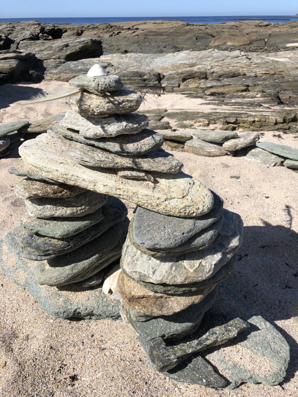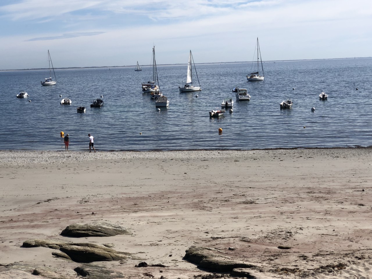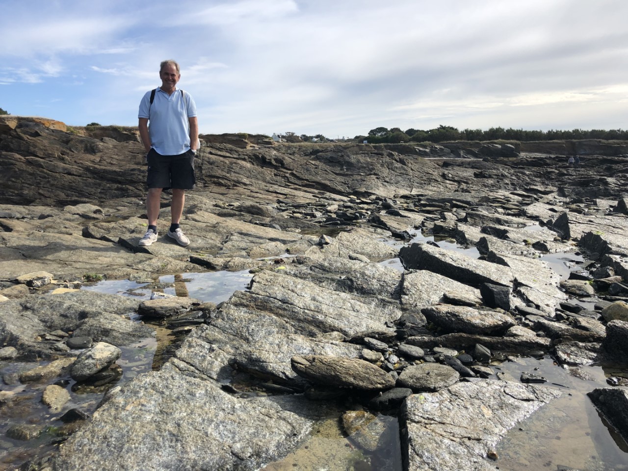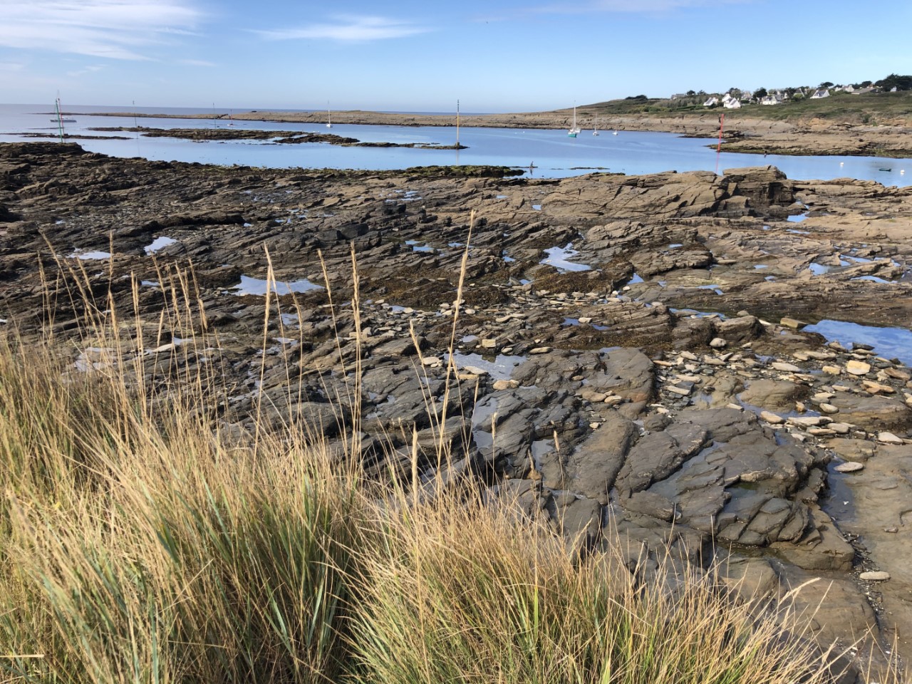 Vandaag lopen we één van de fameuze wandelroutes van Marianne. Daarvoor moeten we eerst een stuk met de bus. Eerst maar eens uitzoeken hoe die rijden op het eiland. We zijn er inmiddels achter dat de bus vertrekt, nadat er een veerboot is aangekomen. Maar of ze vaste routes rijden is nog onduidelijk. Bij het toeristenburo kregen we iets van een Timetable, maar die klopte niet met het matrixbord buiten waarop de vertrektijden stonden. Dus even binnen vragen bij het ticketverkooppunt van de veerboten. Volgens de mevrouw zal de eerste veerboot om 12:00 uur pas binnen komen. Dat was het derde verschillende tijdstip, lekker duidelijk. Toen we net weer op de Just waren, hoorden we de luide scheepshoorn van de veerboot. We keken op de kade en ja hoor, daar stond een busje. Dat busje vertrok 10:20 uur uit de haven en bracht ons op verzoek naar Locmaria. Dit is een slaapstadje met een kerkje en een plaatselijke markt, nu één tafel, met een paar potjes honing voor €6,-. Ze had het niet druk. Locmaria ligt aan een baai met wat moorings. Wij gingen richting baai om daar de wandeling te starten. We hadden het getroffen, want het is laag water en bij eb kunnen we over de zilveren rotsen van Pointe des Chats huppel de hup lopen. Bij Marianne sloeg de zilverkoorts toe, want bij iedere stap werd er gezocht naar stenen met zilveren schittering erin. De mooiste werden bewaard. Er hingen overal waarschuwingsbordjes op de stenen niet te rapen of los te hakken, maar wij kunnen slecht Frans lezen. De wandeling ging verder en ondertussen zagen we vele mooie ankerplekjes voor als het rustig weer is. Eindelijk hadden we een rustmomentje, een “Rood strand” Plage les sables rouges. En inderdaad, het zand is daar rood gekleurd. Het wandelpad bracht ons verder en na een flinke klauterpartij en de bij behorende afdaling bij een volgend heel groot, mooi strand. Hier hebben we een uurtje liggen bakken. Via een steil pad omhoog kwamen we weer op onze wandelpad voor onze laatste meters naar de Just. De voetjes gingen lekker omhoog. We raakten aan de praat met onze buren, Nederlanders die hier al 4 jaar rondzeilen. Ook met Passeport Escales en hun ligplaats in Arzal hebben. Vlak bij onze winterhaven. We kregen wat tips van mooie havens, die we nog kunnen bezoeken. Marianne ging kokkerellen en bij gebrek aan een lekkere ijssalon ben ik naar de Intermarché gelopen voor een beker ijs. Deze smaakte heerlijk na de lekkere nasischotel van Marianne. Morgen naar het vaste land om daar te beslissen of we hier nog terug komen of een eilandje verder gaan.