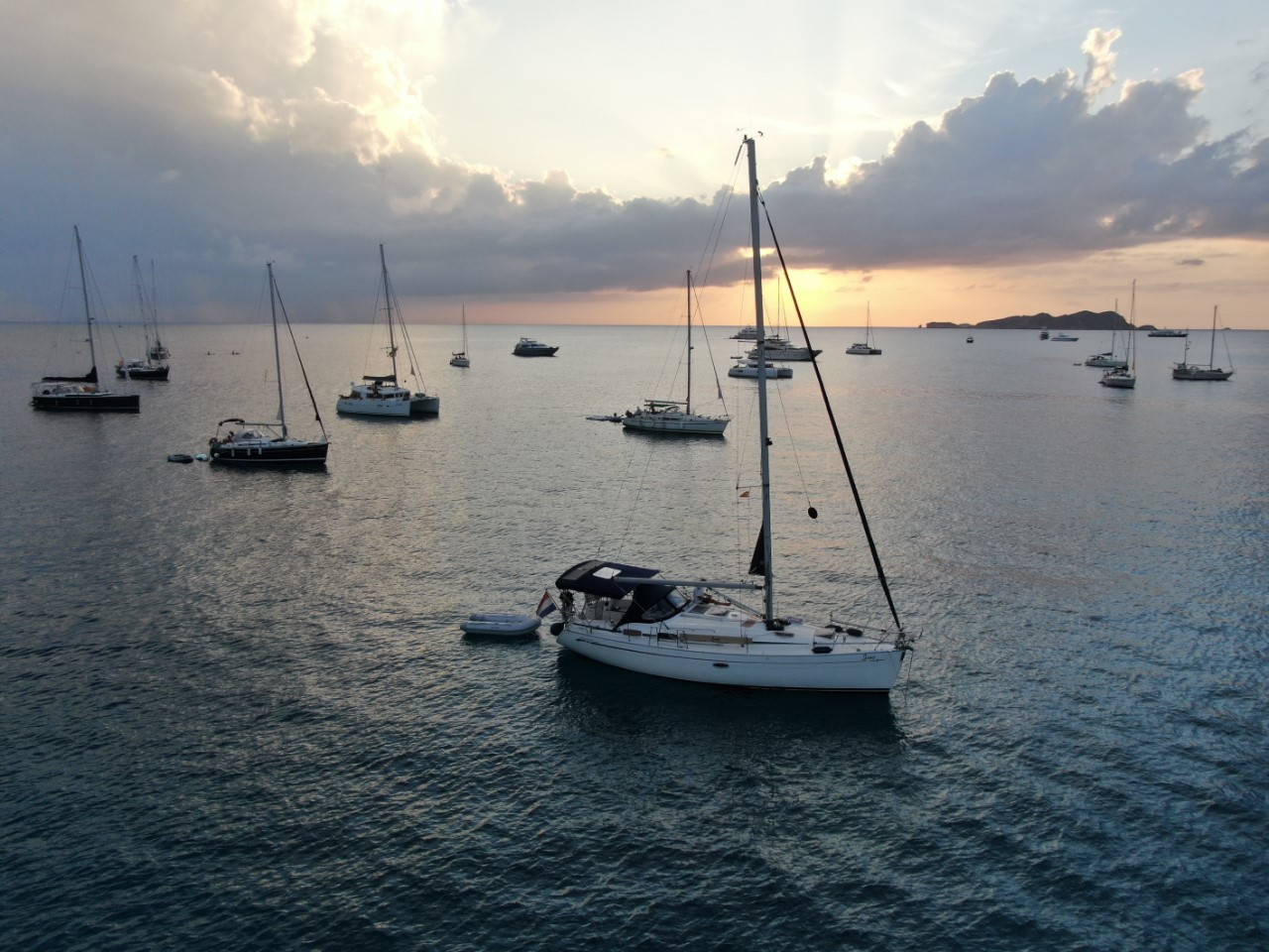 Onze vlag hangt erbij en ik heb het lusje van de bovenzijde vernieuwd. Vanmorgen vroeg heb ik het laatste muggenhorretje gemaakt en ik denk dat de klusjes gedaan zijn. Het wordt wat bewolkter en ik krijg van Natasja een waarschuwing dat er onweersbuien aankomen. Ik heb alle luiken gesloten en het anker extra gecontroleerd. De bewolking gaat over in donkere wolken en er steekt een windje op. Als het echt begint te waaien, start ik de motor en zet de instrumenten aan. De zomerstorm gaat gepaard met flinke windstoten tot wel 35 knopen, zwaar onweer, bliksem en iets later komt de regen met bakken uit de lucht. Gelukkig ligt de Just als een huis, wat ik niet kan zeggen van de Franse boot die achter me ligt. Die mensen zaten ook rustig binnen, maar geruime tijd later komen ze er toch achter dat hun anker niet goed meer houdt en ze halen het anker in en vertrekken. Mooi, daar ben ik vanaf. Zeker vijf andere boten slaan van hun anker en vertrekken, maar er komen ook boten hier schuilen en proberen te ankeren in de storm, wat een onmogelijke actie is.