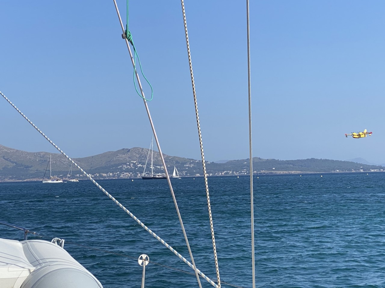 We hadden verwacht, dat we nog wel even zouden gaan zwemmen. Er staat echter weer een straf windje, dat ons voldoende afkoeling geeft. In de namiddag horen we een vliegtuigmotor starten. Na even warmdraaien gaat die te water. Vlak voor de Just langs vaart die naar z’n startplek. Deze ligt bijna in het verlengde van de Just. Gelukkig, net op tijd komt het vliegtuig uit het water en draait mooi van ons weg. Of het 2de vliegtuig ook nog gaat vertrekken? We horen of zien het wel.