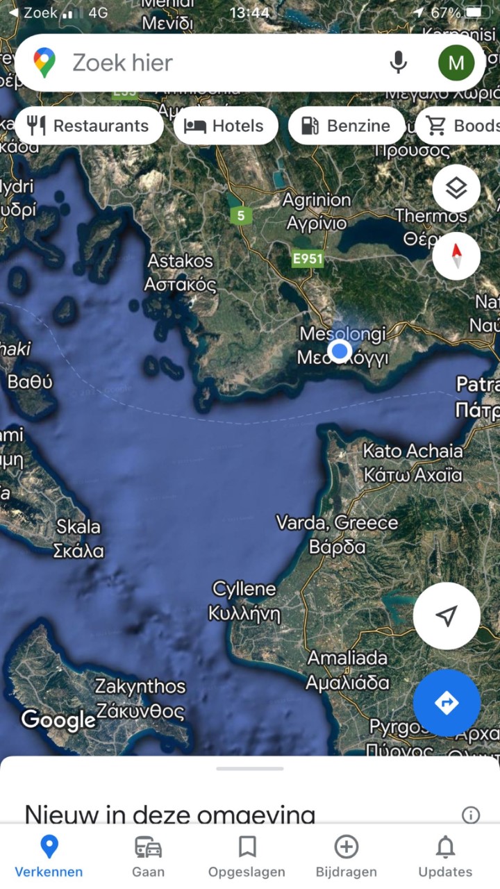 We lopen samen naar de grote zeebassins aan de oostkant van Mesolongi, ze worden voor zoutwinning gebruikt. Daarna door een redelijk gezellige winkelstraat en we drinken een drankje. We komen langs een ‘heldenpark’. De laatste paar honderd meter naar de Lidl is een weg zonder behoorlijke stoep en we lopen daar af en toe op de drukke weg. Het is zwaar puffen, want het loopt al naar de middag en het is 37 graden. Met een rugzak en twee volle tassen lopen we een andere route naar het bijbootje. Die weg gaat door een autovrije promenade, tenminste dat was ooit een promenade. Nu zijn erg veel winkelpandjes verlaten en besmeurt met graffiti, het is een troosteloos zooitje.