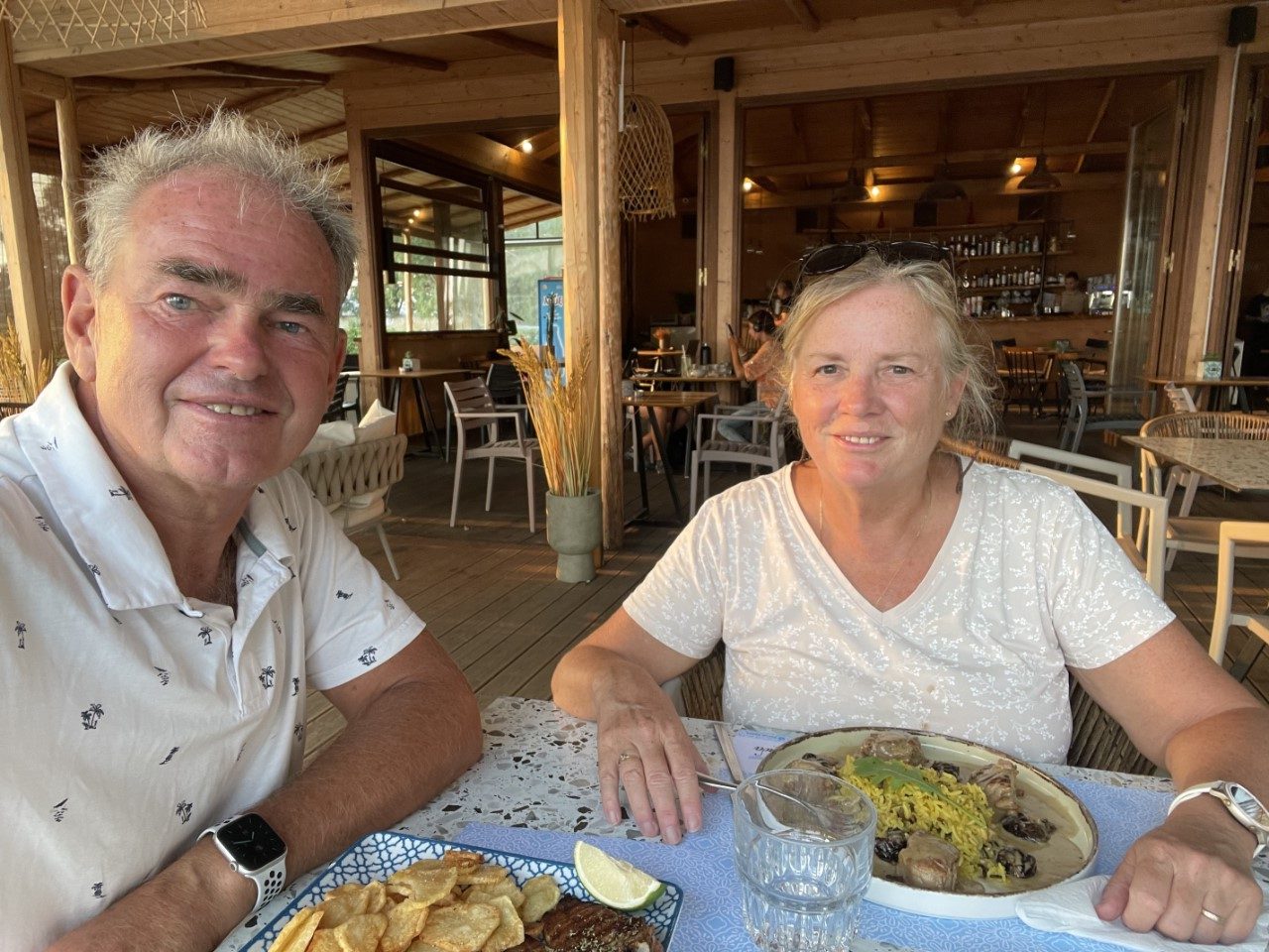 We willen rond 18:00 uur een hapje gaan eten bij een restaurantje op de kade met uitzicht op de Just. Tegen 17:00 uur horen we het donderen tussen de bergen en de lucht gaat van helder blauw naar donker grijs. We verwachten een buitje en wachten die af, voordat we naar de kant gaan. De wind neemt flink toe en dat veroorzaakt een kleine zandstorm op onze ankerplek. Als de wind wat afneemt, nemen we het risico en gaan een stuk later een hapje eten. Het voorwerk dat we hebben gedaan naar de vraag waar gaan we eten, pakt goed uit. Marianne heeft varkensmedaillons met een romige pruimensaus met spek en wilde rijst en ik heb een grote porksteak met gebakken aardappeltjes.
