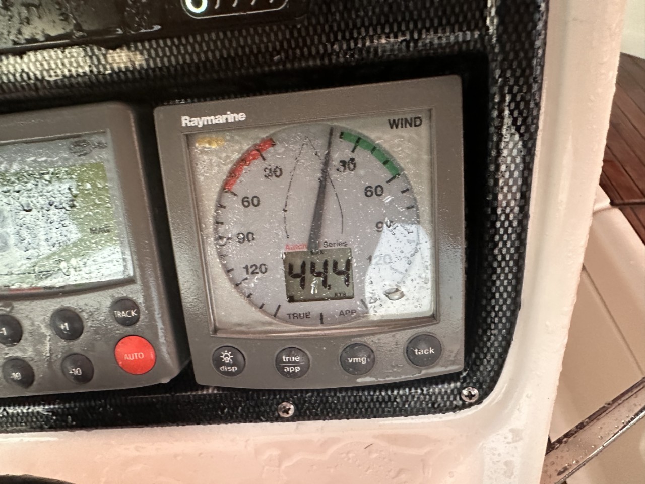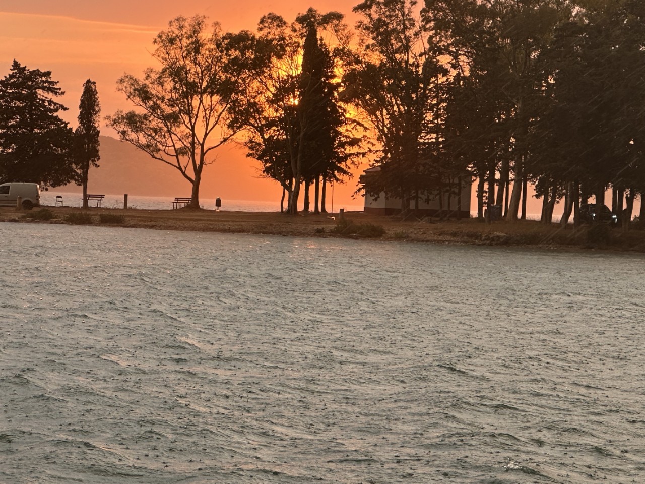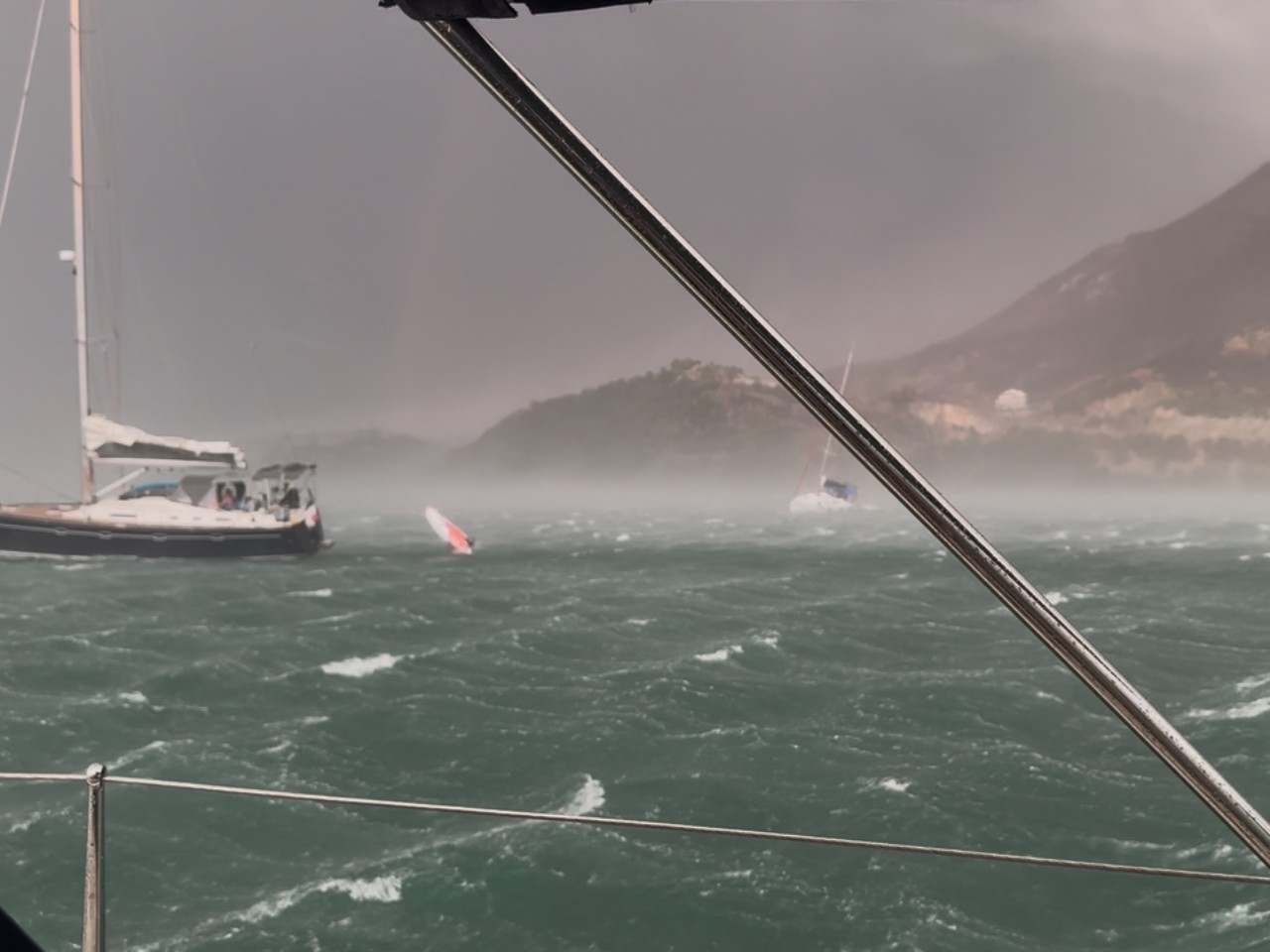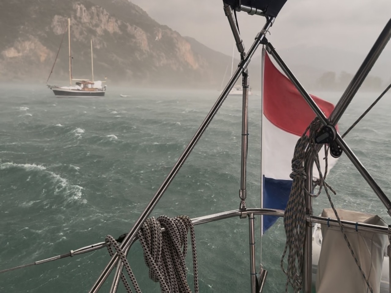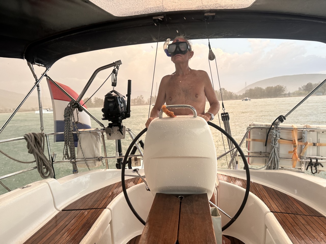 We hoorden het al af en toe donderen in de verre verte, hoewel we in eerste instantie dachten dat het opstijgende vliegtuigen waren. Toen de donders langer duurden ging Marianne de weerapps controleren. Daar kwam toch een flink front langs de gehele Griekse kust onze kant op. Volgens de apps vooral boven land, dus we hadden de hoop dat het langs ons heen af zou drijven. Helaas kwam het front snel dichterbij. Het begon al wat te weerlichten om ons heen en de lucht werd snel donkerder. We sloten alle luiken en maakten ons gereed voor wat er zou gaan komen. Het begon met een paar dikke druppels en snel daarna brak de hel los. Hoge golven in de baai, een loeiende stormwind van 44,4 knopen (storm, windkracht 9) en bakken met regen. We hadden de motor bijstaan voor het geval, dat we van ons anker af zouden slaan. Zo deden ook de andere boten in de baai. Drie boten sloegen inderdaad door de harde wind van hun anker. De Just hield het goed en zwaaide heen en weer achter zijn anker. Een losgeslagen boot had na honderden meters ook zijn motor aangekregen en draaide daarna gevaarlijk tussen de andere boten door de baai. Gelukkig zijn er geen botsingen geweest, vooral dankzij de ruimte die er is. De regen sloeg zo hard in m’n gezicht dat ik met een duikbril achter het stuur stond. Ons toch best zware rubberbootje ging vliegen aan zijn lijnen. Na een klein uurtje namen de wind en de regen af en werd het weer net zo rustig in de baai als de rest van de dag. We hebben wel een foutje gemaakt. Ik had naar Marianne moeten luisteren en de bimini moeten opruimen en Marianne had me flink op mijn lazer moeten geven. We waren nu een windvang en we zijn het schaduwlapje kwijt. De bimini zelf heeft het ternauwernood overleefd.