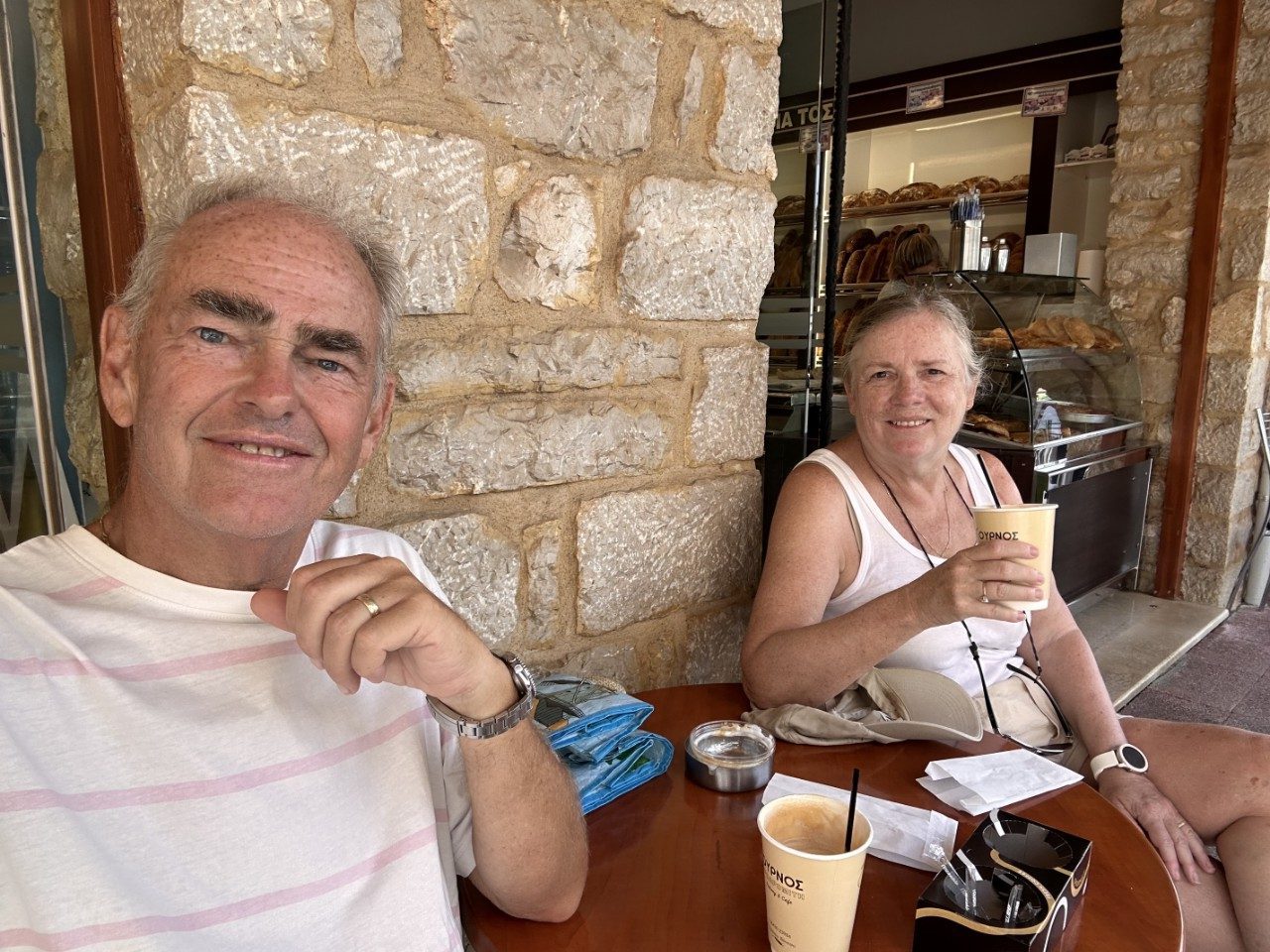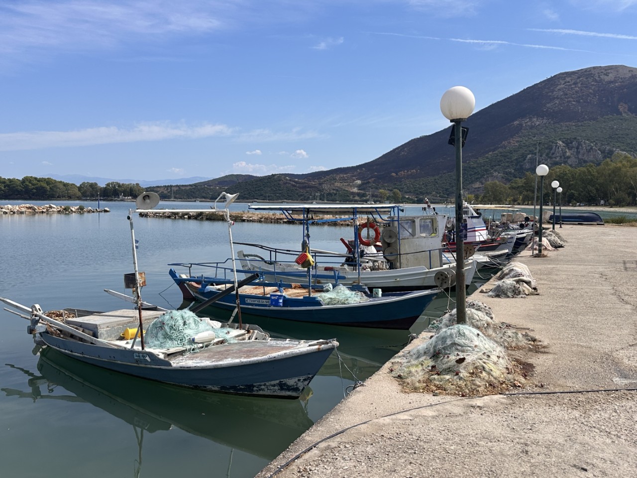 Daarna ondernemen we nog een pittige wandeling naar Vonitsa. We wandelen langs het strand met de ligbedjes en parasols en de vissershaven. Langs de stadskade ligt een schip met Hollandse vlag. Ook zij blijken flink geschrokken te zijn van de plotselinge storm. Bij de bakker strijken we behoorlijk verhit neer voor een lekkere ijskoffie en om wat uit te rusten van de iets te inspannende wandeling. Nadat we wat vers brood en wat boodschappen gehaald hebben, wandelen we zoveel mogelijk in de schaduw terug naar het bijbootje. Aan boord nemen we gelijk een verfrissende duik in het warme badwater rond de Just en we gaan lekker in de relaxstand. Voor de avond maken we een lekkere Normandische vissoep.