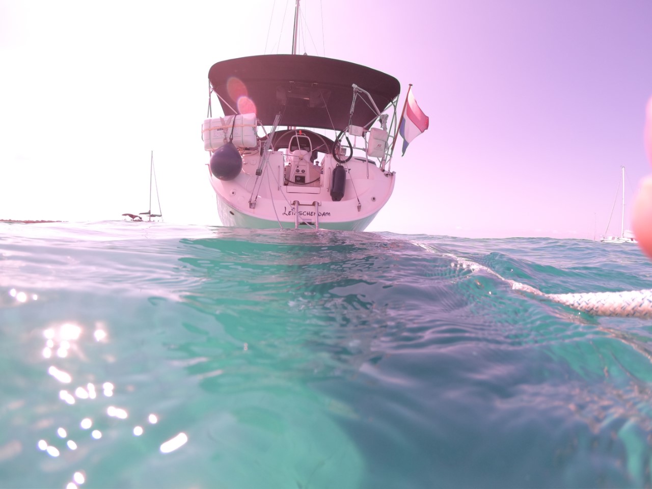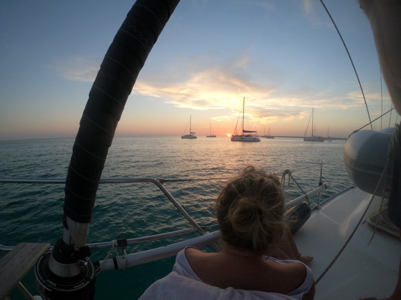 Terug op de Just hebben we het bijbootje opgeruimd. Het motortje hebben we samen aan de achterreling gelierd en het bootje heb ik op het voordek gelegd. Voorlopig hebben we die niet nodig de komende week. Na even naar de zonsondergang te hebben gekeken, heb ik nog een duik genomen in het lekkere water. Waarschijnlijk de laatste duik in Mallorca.