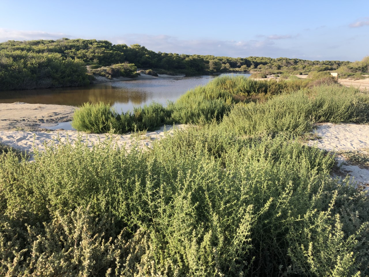 Na ons culinaire maaltje zijn we met het bijbootje naar het strand gemotord om een stukje te gaan wandelen op het strand. Het strand had hier en daar wat rotsen, maar er was met boeien aangegeven waar je op het strand kon komen. Daar hebben we het bootje op een zanderig gedeelte een stukje op het droge getrokken. We dachten nog een stukje van het achterland te zien, maar dat viel iets tegen. We kwamen wel langs bassins die ooit lang geleden voor de zoutwinning dienden, toch een klein stukje historie. Het pad liep verder langs een parkeerterrein en terug via vrij saaie begroeiing langs een restaurant en terug op het strand.